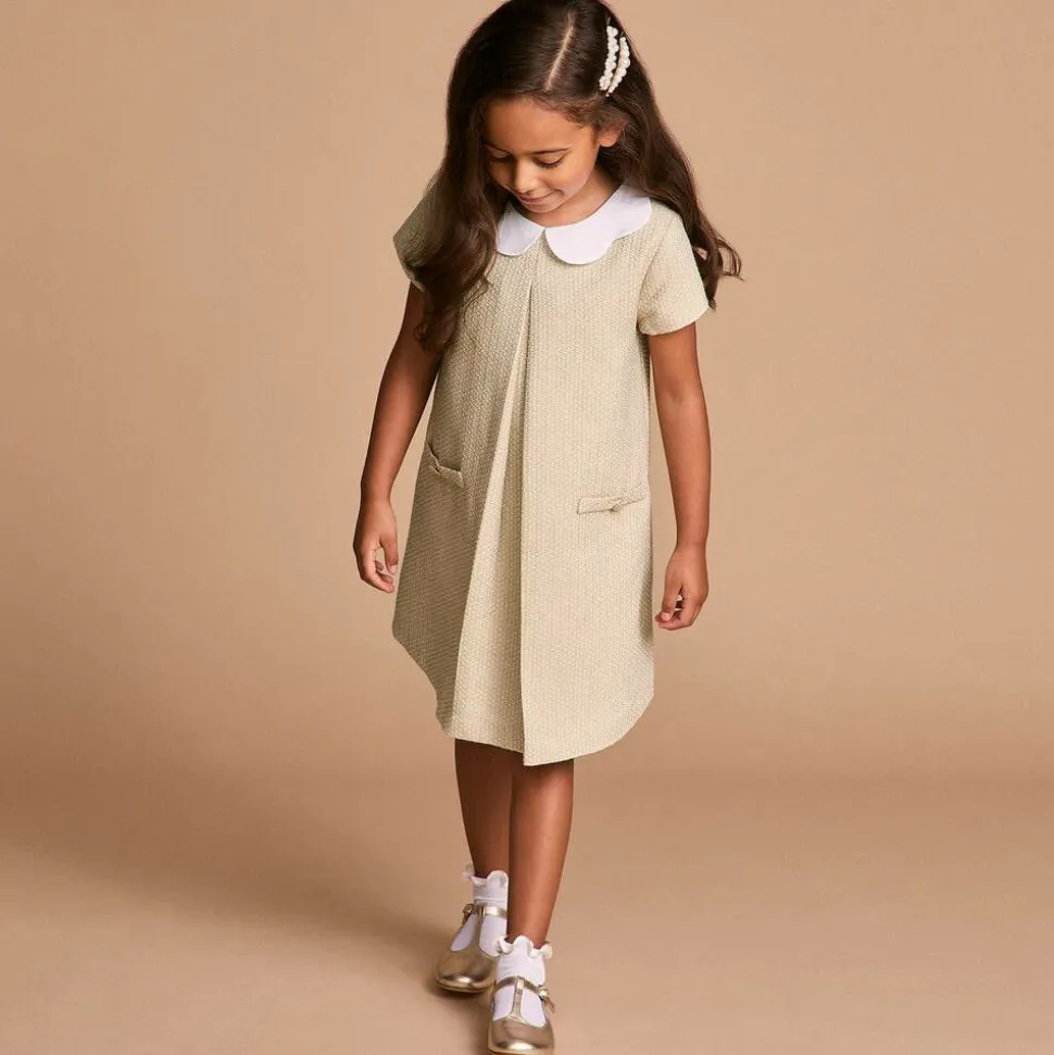 Pale gold T-bar shoes for girls by traditional British brand Beatrice & George, exclusive to Childrensalon. Made in soft, supple leather, they have a cushioned footbed for comfort and a super soft leather lining. They fasten with a silver buckle and have a faux leather outer sole.