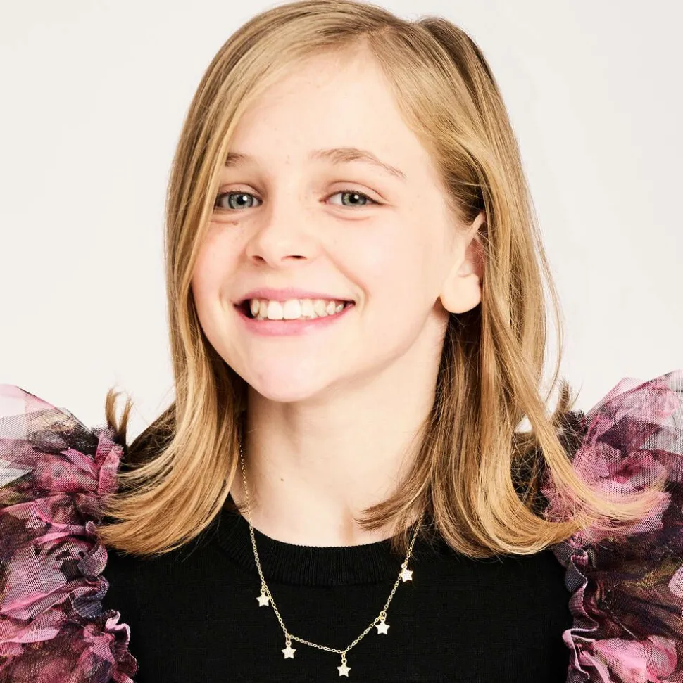 Beautiful gold-plated necklace for girls from Angel's face. Five star charms dangle from the centre of the chain, each embellished with diamantés for a touch of sparkles. The chain fastens with a clasp and can be adjusted for a personalised fit.