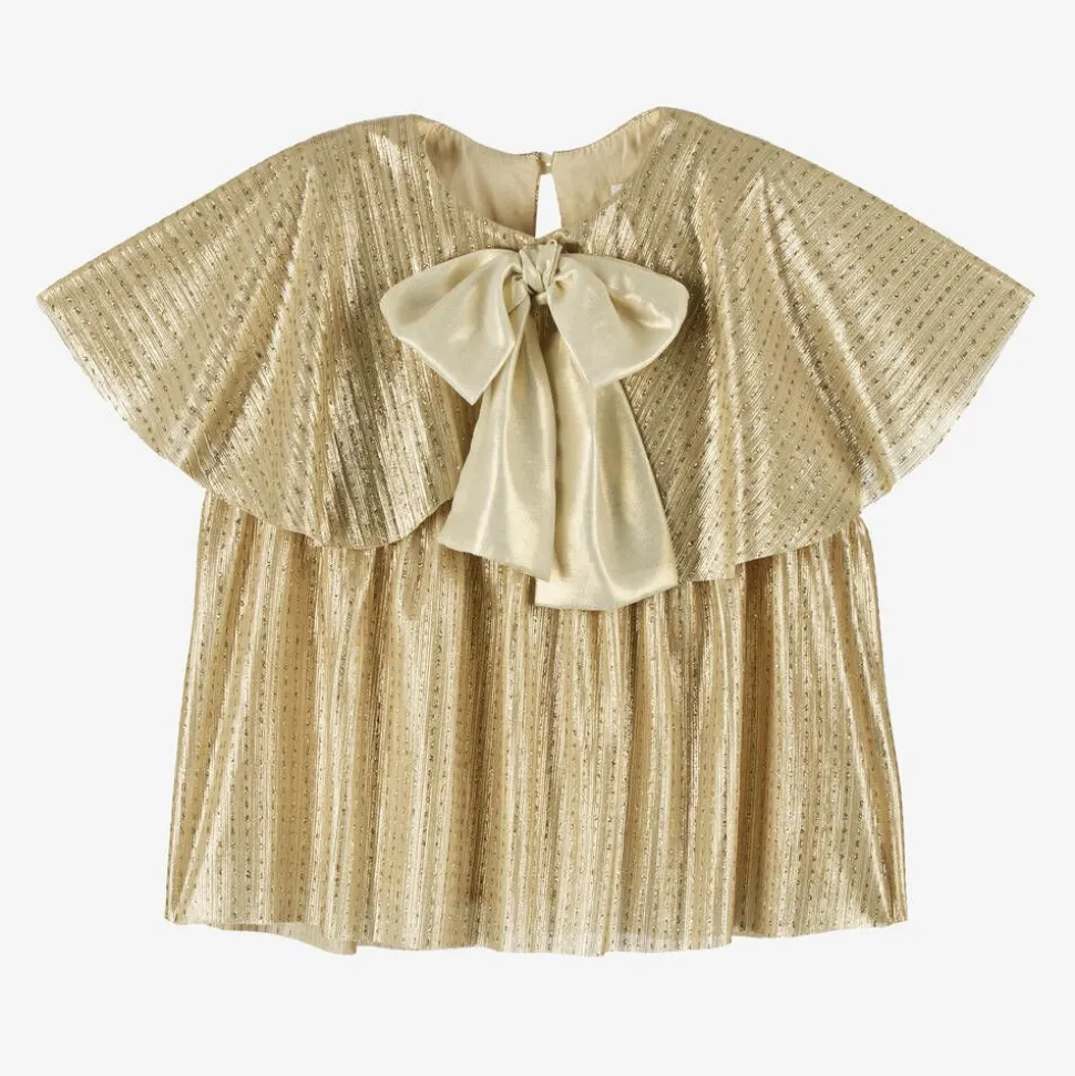 Pretty sparkly gold blouse for girls by EIRENE, made in soft and stretchy plissé fabric. Lined in soft cotton, the short sleeves are created by a floaty cape effect over the shoulders. There is a contrast gold bow on the front and a keyhole button fastening on the back.