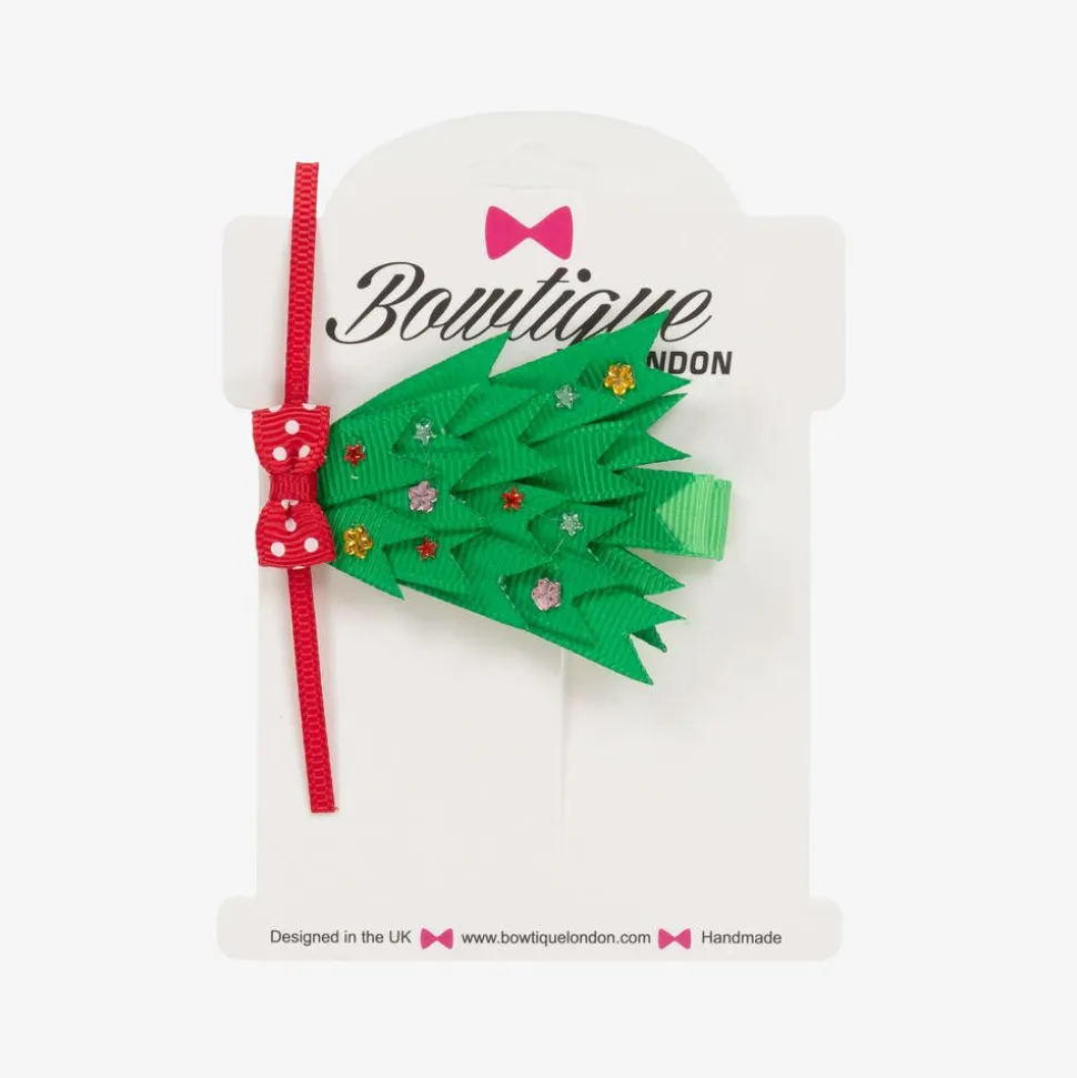 Festive green and red hair clip for girls by Bowtique London. In the shape of a Christmas tree, it is handmade in grosgrain ribbon with sparkling beads. It fastens with a metal clip for secure wear.