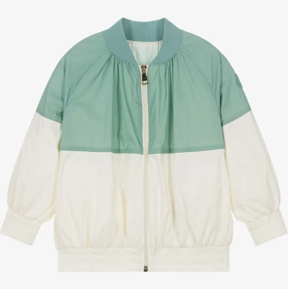 In ivory and sage green, this lightweight jacket for girls is by luxury brand Moncler Enfant. Made in silky smooth nylon, it has a ribbed collar and elasticated trims, providing just enough warmth for the mid-season. The signature felted logo is in tonal green on one sleeve, adding a subtle yet distinctive designer touch. There are useful side seam pockets, with a branded gold zip puller.