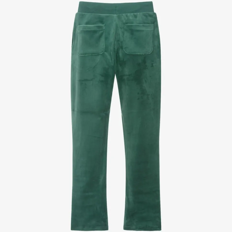 Lovely green joggers for girls by Juicy Couture, made in the brand's signature velour. With stylish flared legs, they have a sparkly diamanté monogram logo on the front, adding a touch of glamour to the laid-back look. Super soft and stretchy for casual days or lounging, they have side seam and back pockets and a drawstring waistband for a comfortable fit.