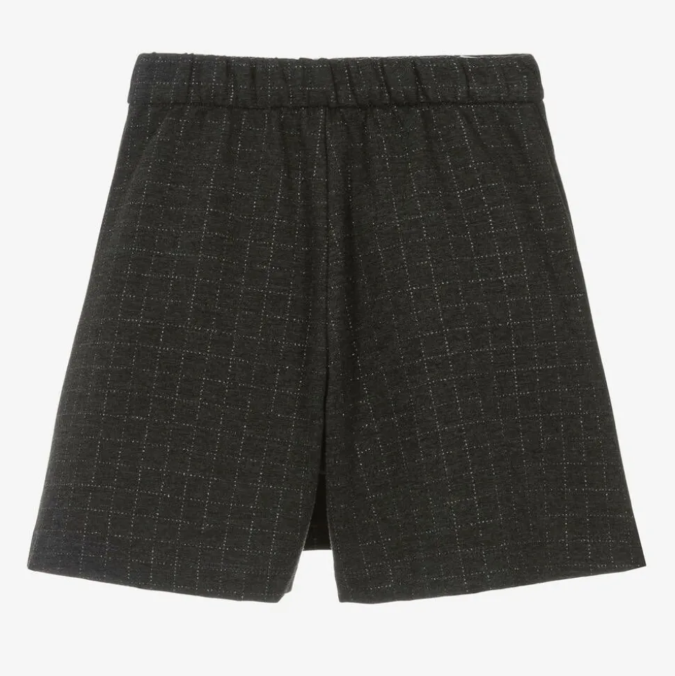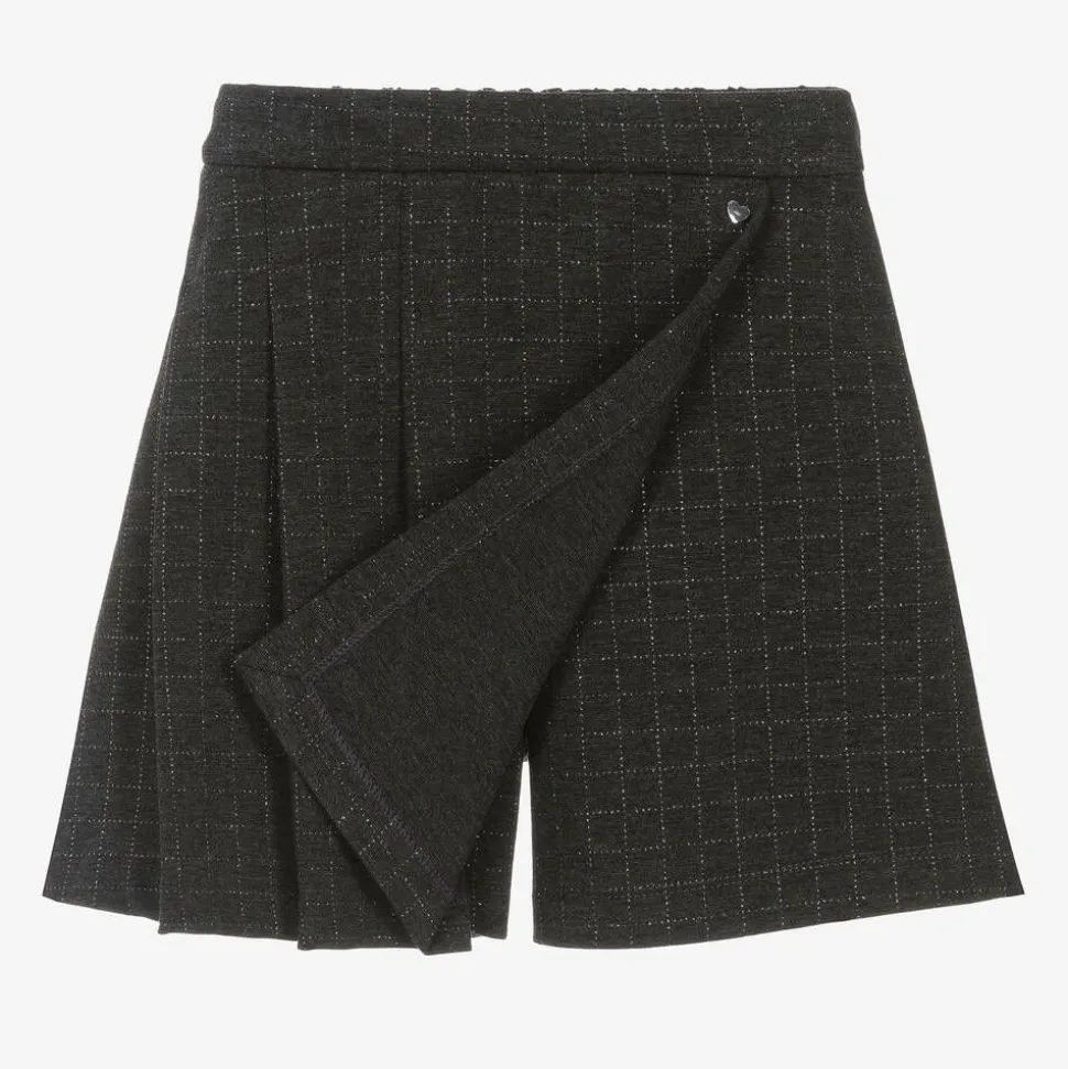 Dark grey check skort for girls by Monnalisa, made in soft Milano jersey. Embroidered with a shimmering silver thread, this preppy design has a wrap-style front and a shiny silver heart logo charm. The waistband is elasticated for a super comfortable yet smart fit.