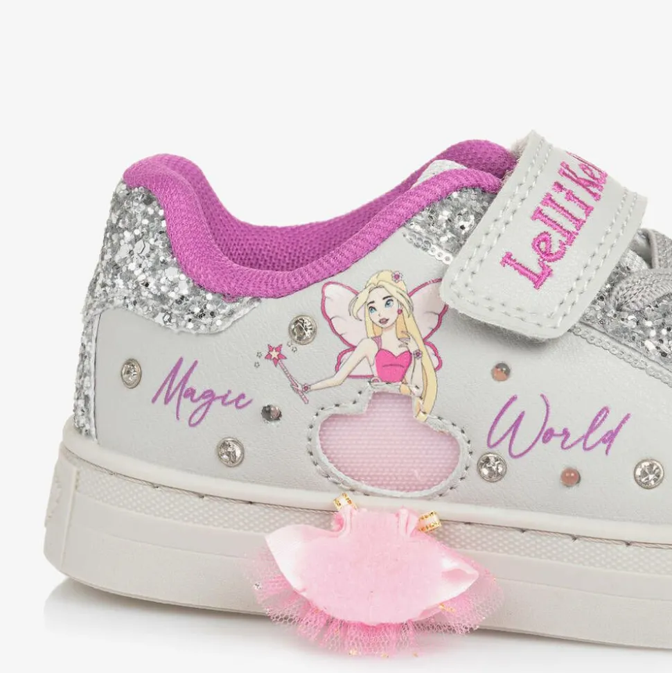 Grey faux leather trainers for girls by Lelli Kelly, with sparkly, glitter trim. They have a beautiful pink fairy print on the side that comes with a selection of skirts, attached with velcro. Designed with elasticated laces and a logo-embroidered velcro strap, they have a removable leather insole and flexible, non-slip rubber outer sole. For added fun, they feature sparkly diamantés on the sides which light up when walking.
