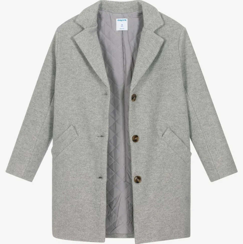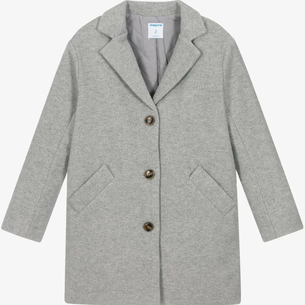 Lovely grey felted coat for older girls by Mayoral, with a soft wool feel. Faux tortoiseshell buttons fasten the front in a timeless style. It has a quilted lining for comfort, a vent on the back for ease of movement, and pointed lapels for a smart finish.