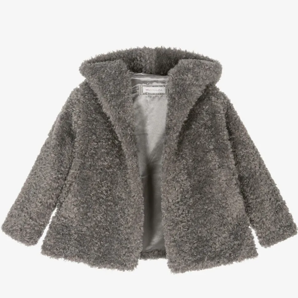 Gorgeous grey hooded coat for girls by Italian brand Monnalisa, made in super soft, cosy faux fur. Lined in sumptuous satin, it has useful, slanted pockets and concealed popper fastenings on the front.