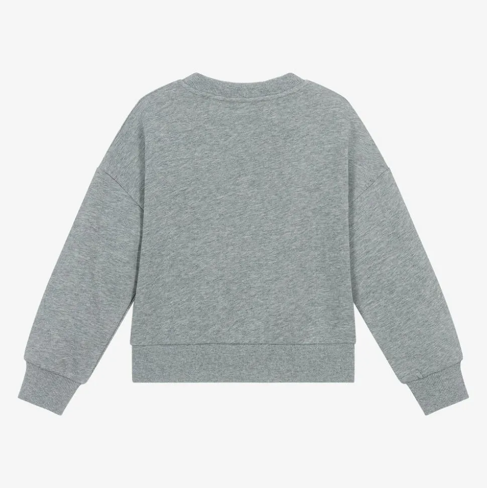 Casual grey marl cotton sweatshirt for girls by KENZO KIDS, with the brand's distinctive Paris logo printed on the front in pink. Made in comfortable jersey, it is warm and fleecy on the inside and styled with a crew neckline. It has ribbed trims and dropped shoulder seams for a more relaxed look.