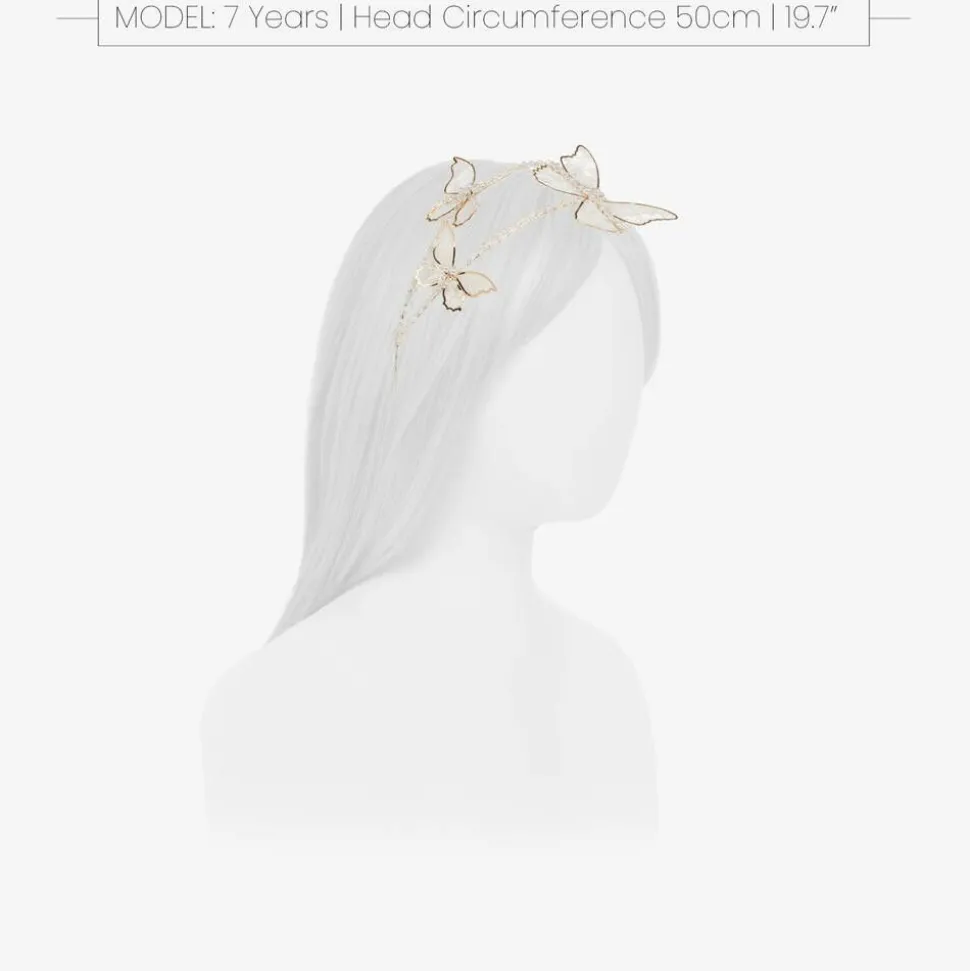 Stunning special occasion hairband for girls by Junona. A beautiful finishing touch to her outfit, this double stranded metal hairband is trimmed with ivory and crystal beads for a hint of sparkle. Delicate ivory lace and gold metal butterfly decorations add a beautiful touch . The flexible metal band has looped ends where ribbon ties can be attached for a pretty finish.
