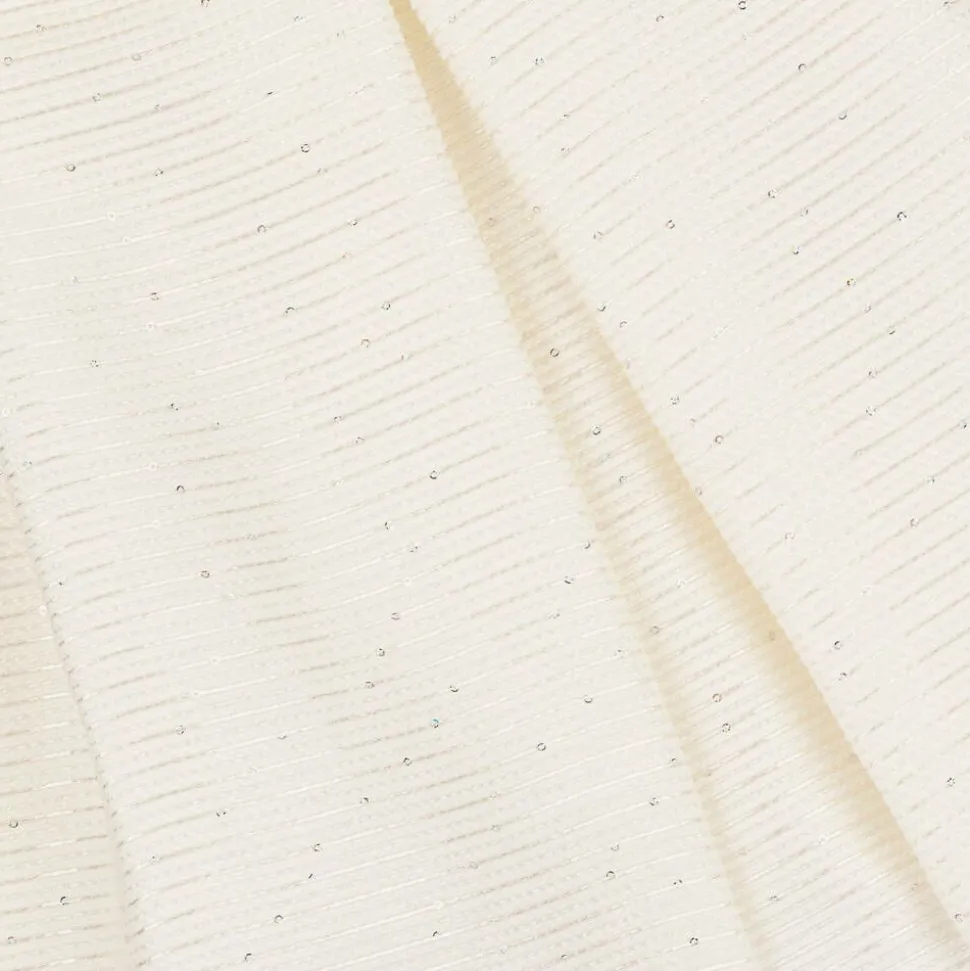 Beautiful ivory special occasion dress for girls by Lapin House, woven with shimmery stripes and delicate sequins. Designed with a stunning bow on the front, this pretty dress has puffed capped sleeves and a flared skirt with wide box pleats. It is comfortably lined in soft cotton and fastens neatly with a concealed zip on the back.