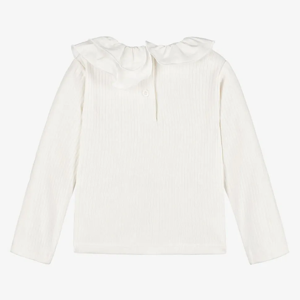 A delightful ivory long-sleeved top for girls by iDO Baby, made from soft ribbed cotton jersey. Fastening neatly with buttons on the back, it has a smooth woven frilled asymmetrical collar for a fun and romantic finish.