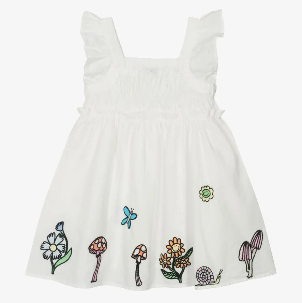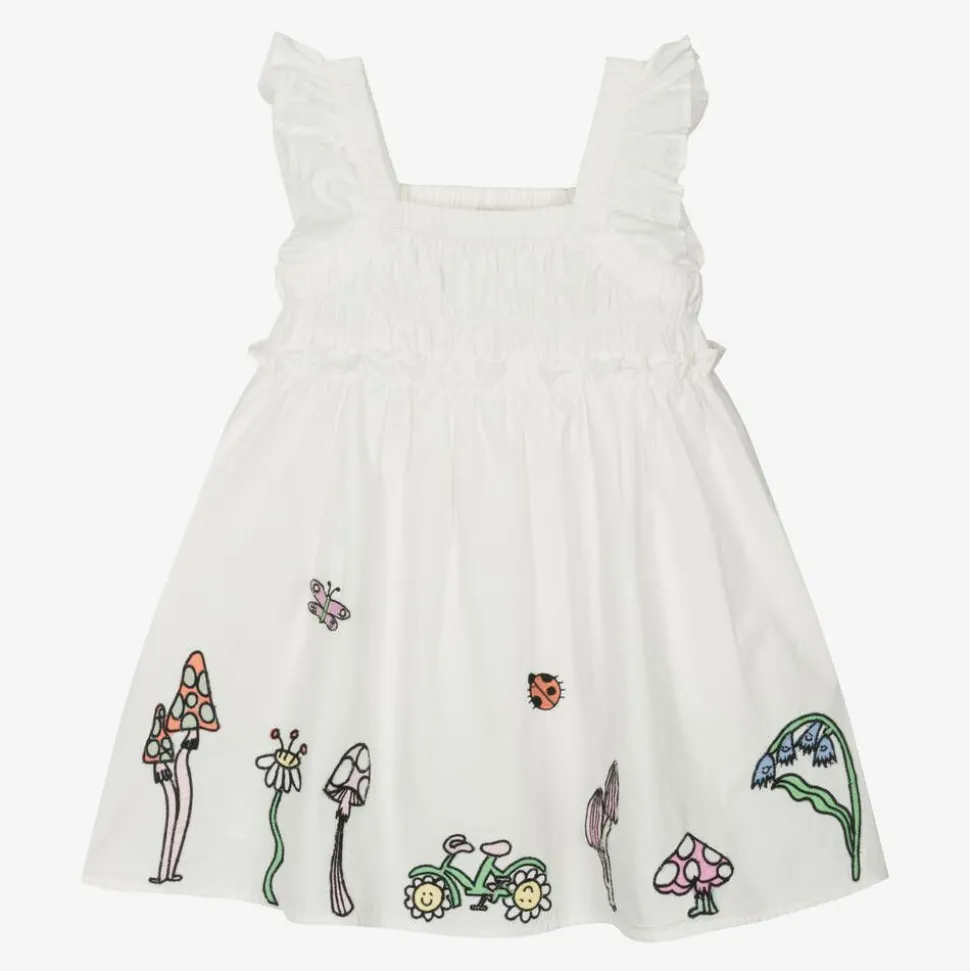 An ivory cotton dress by Stella McCartney Kids, beautifully embroidered with a colourful fairy garden design around the hem. So pretty, it has an elasticated ruched bodice allowing it to slip easily over the head and a sweet square neckline. Made in lightweight organic poplin, it is ideal for warmer days playing amongst the fairies.
