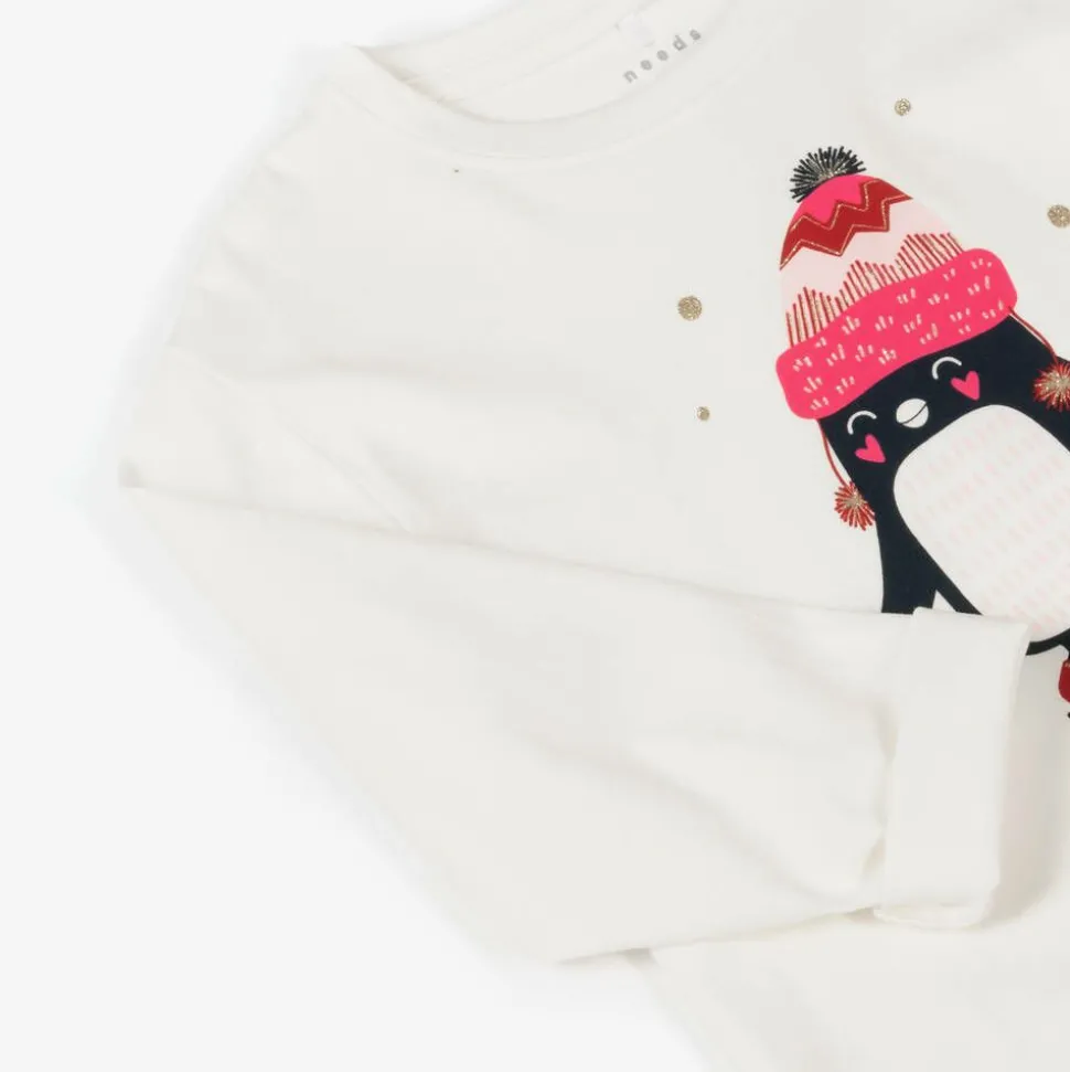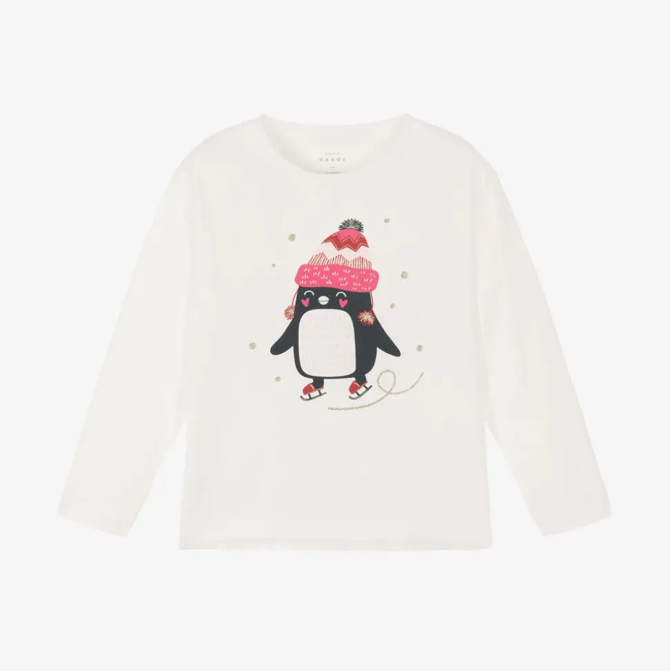 Ivory long-sleeved top for girls by Danish brand Name It, made in soft cotton jersey. It has a stylish dipped hem and a cute penguin wearing a bobble hat and ice skates on the front complete with gold glitter for a sparkly festive finish
