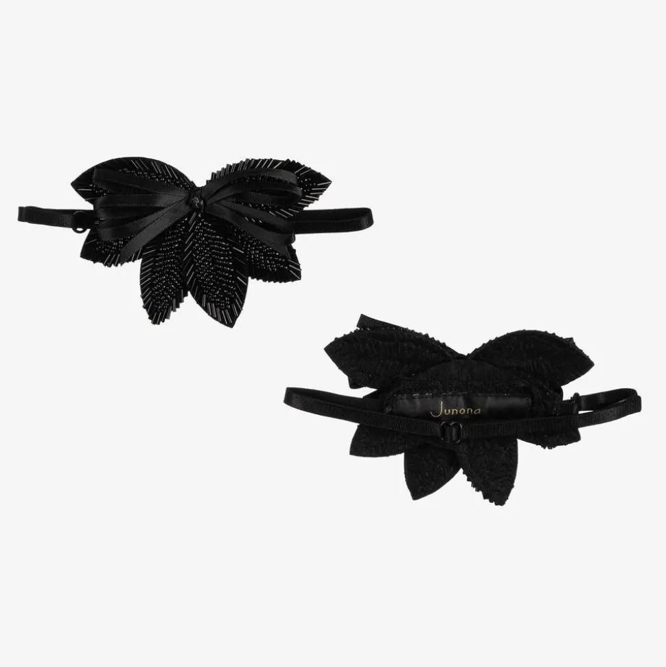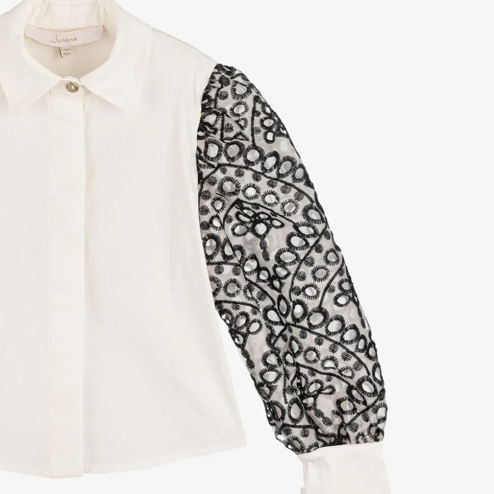 Beautiful ivory cotton poplin blouse for girls by Junona, adding a stylish touch to any special occasion. The dramatic, eye-catching sleeves are long and made in sheer organza, with embroidered black cut work. They are prettily puffed and have deep, frilled cuffs that fasten with golden buttons. The blouse has a covered, button-fastening placket and comes with a striking black beaded decoration with a satin ribbon to be worn around the neck, which is both adjustable and detachable.