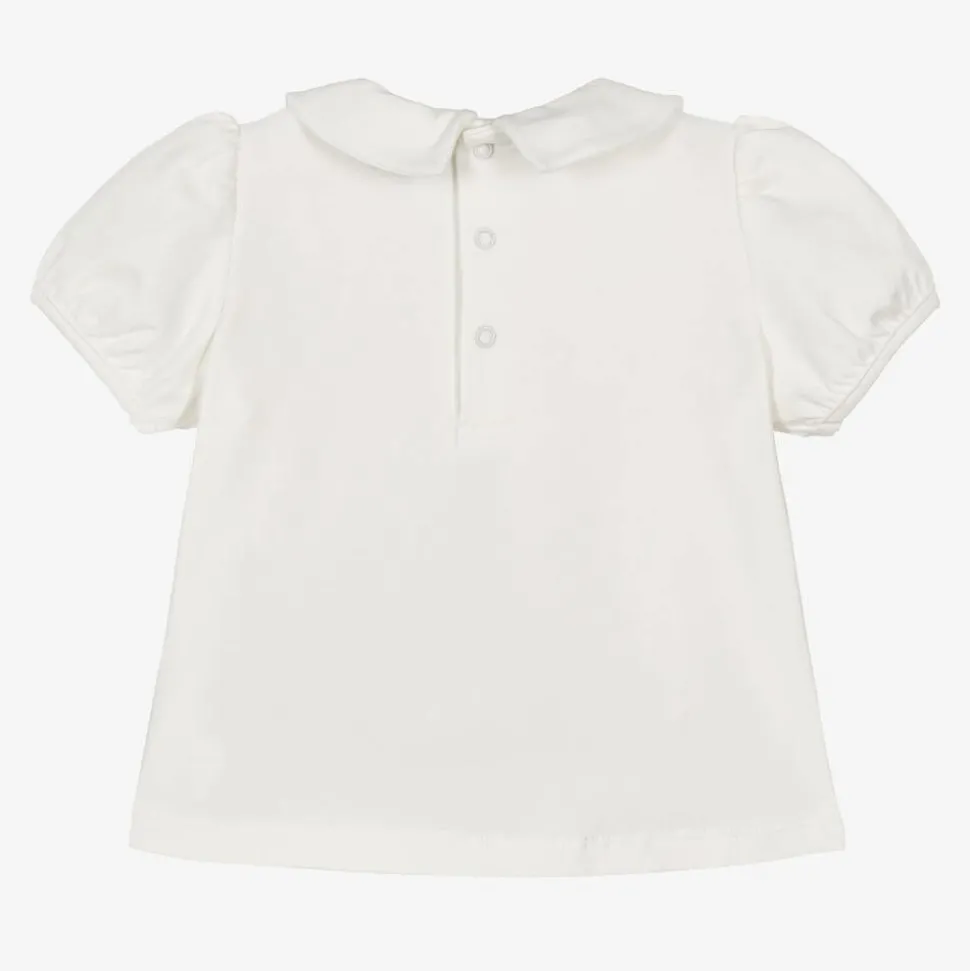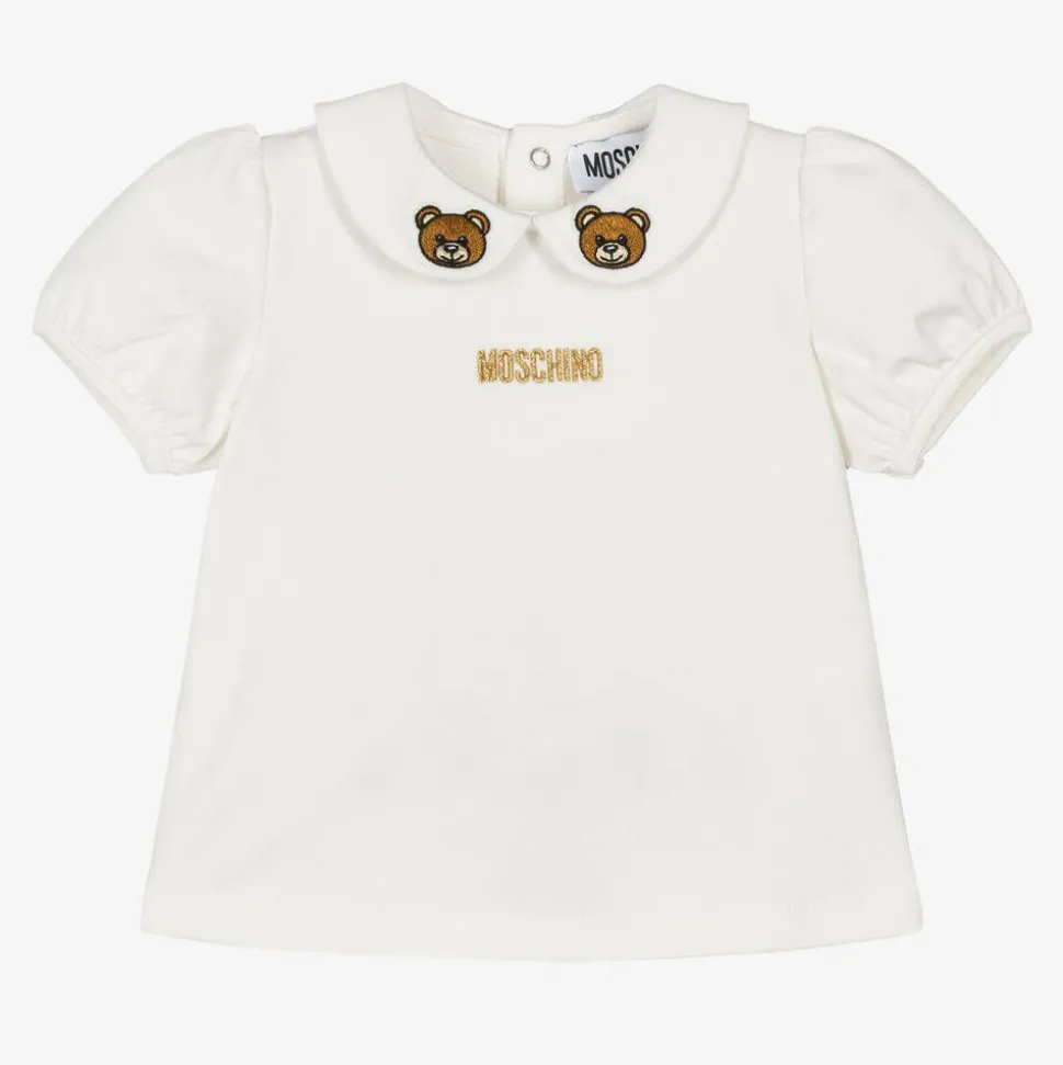 Cute ivory T-shirt for little girls by luxury Italian brand Moschino Baby, made in soft, comfortable, cotton jersey. It has pretty puffed sleeves and fastens with poppers on the back. The designer's iconic Moschino Teddy Bears are embroidered on the sweet Peter Pan collar, and a glittery gold logo is embroidered on the chest.