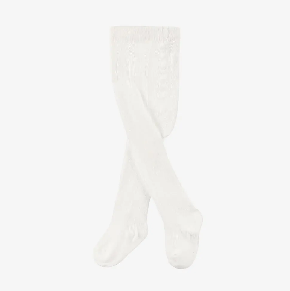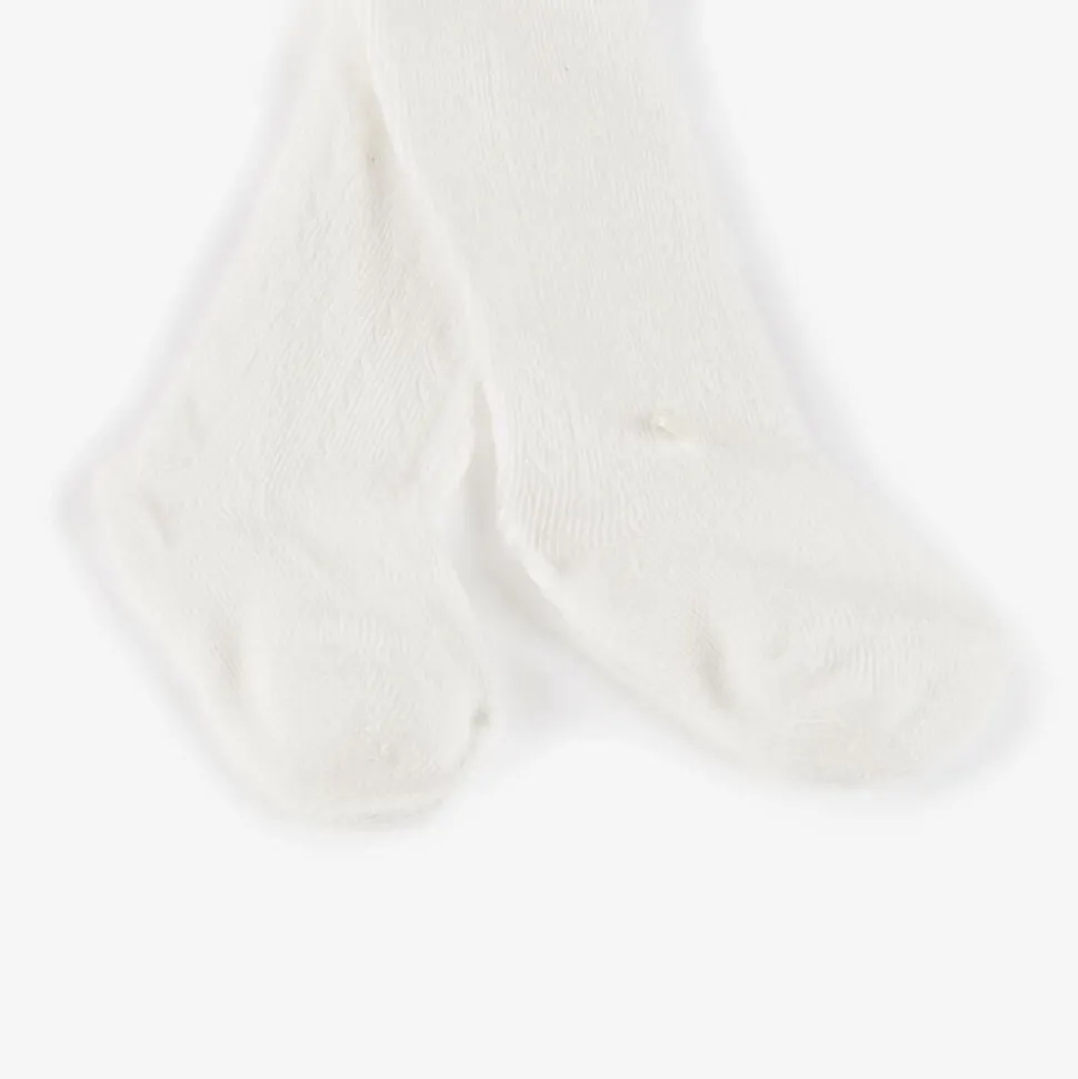 Pretty ivory tights for girls by French brand Tartine et Chocolat. Knitted in a soft and stretchy cotton blend, they have a delicate pointelle pattern and a pearly logo disc on one ankle.