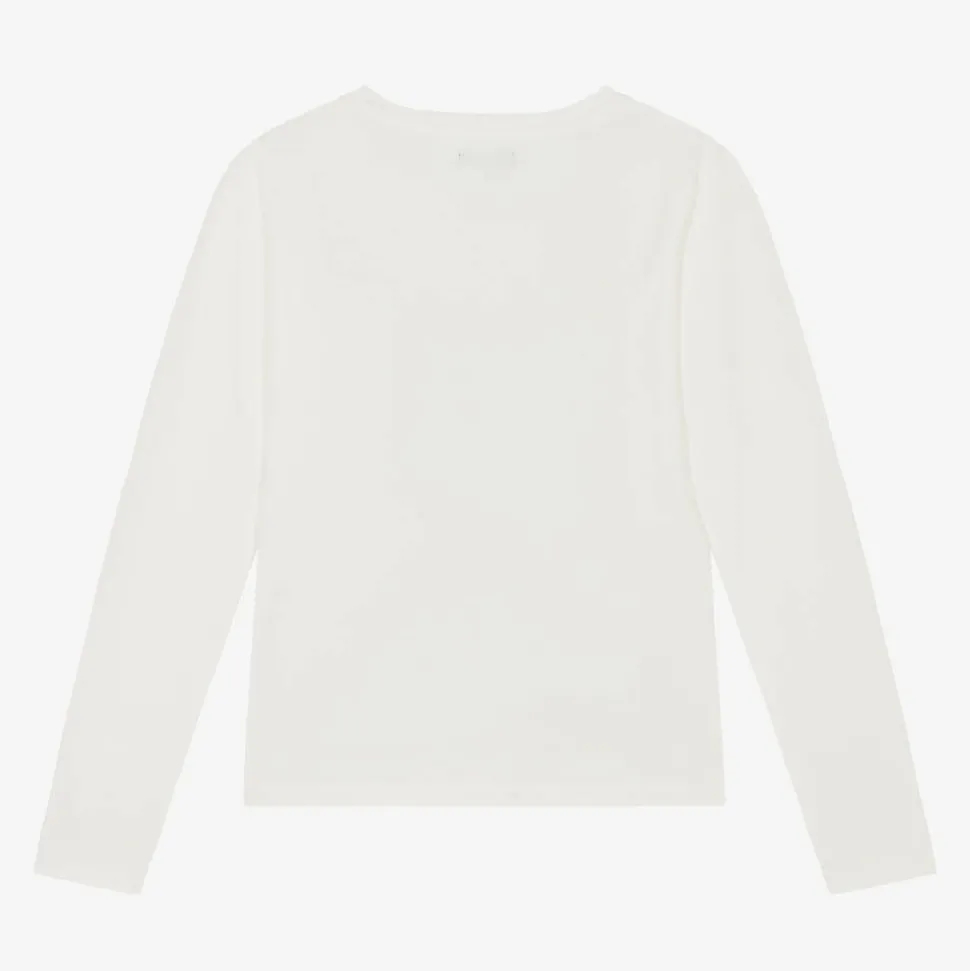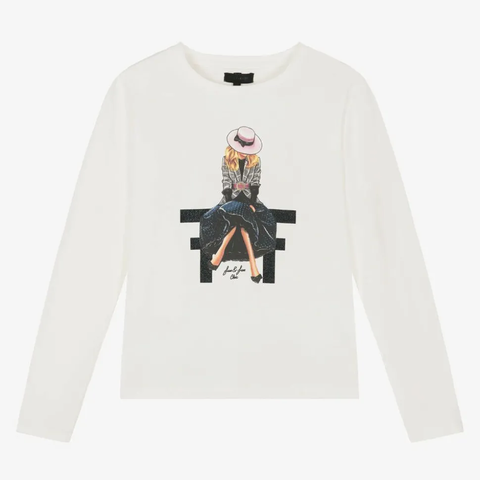 Ivory long-sleeved top for girls by Italian brand Fun & Fun. The front features a stylish lady sitting on a logo-inspired bench, with a small text logo below. This casual tee is made in comfortable jersey, with a crew neck.