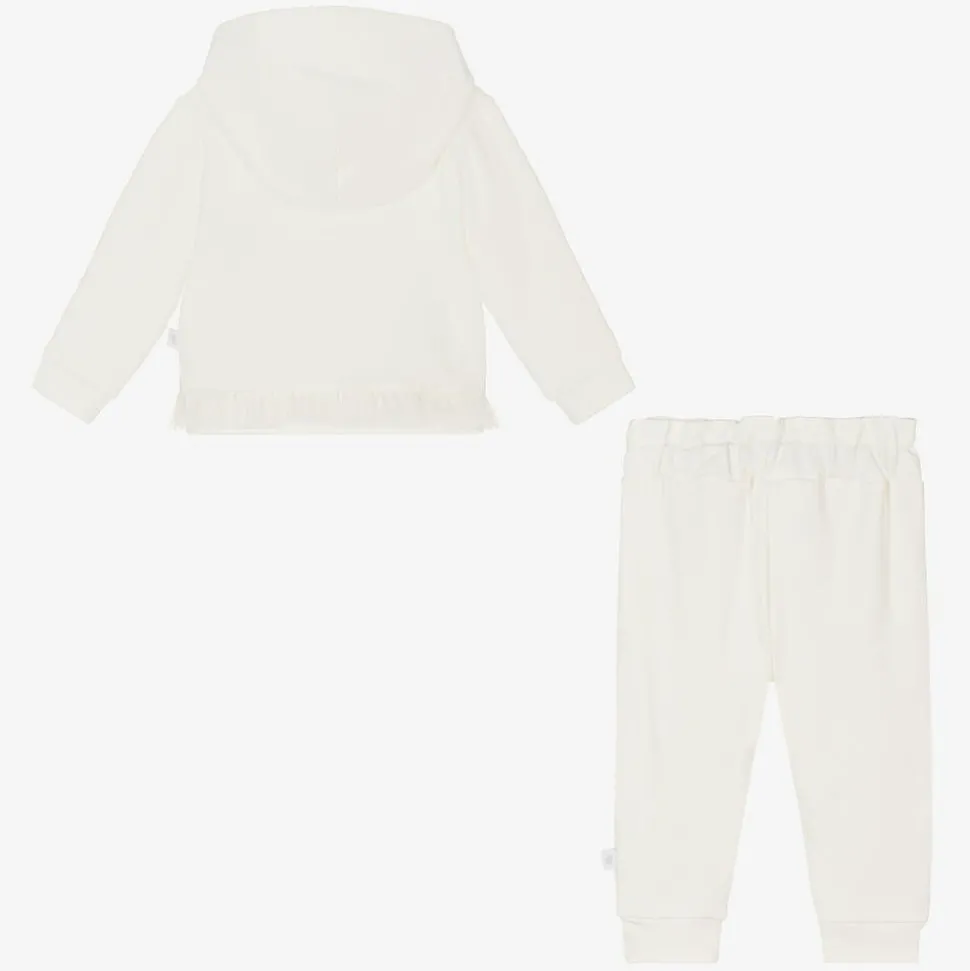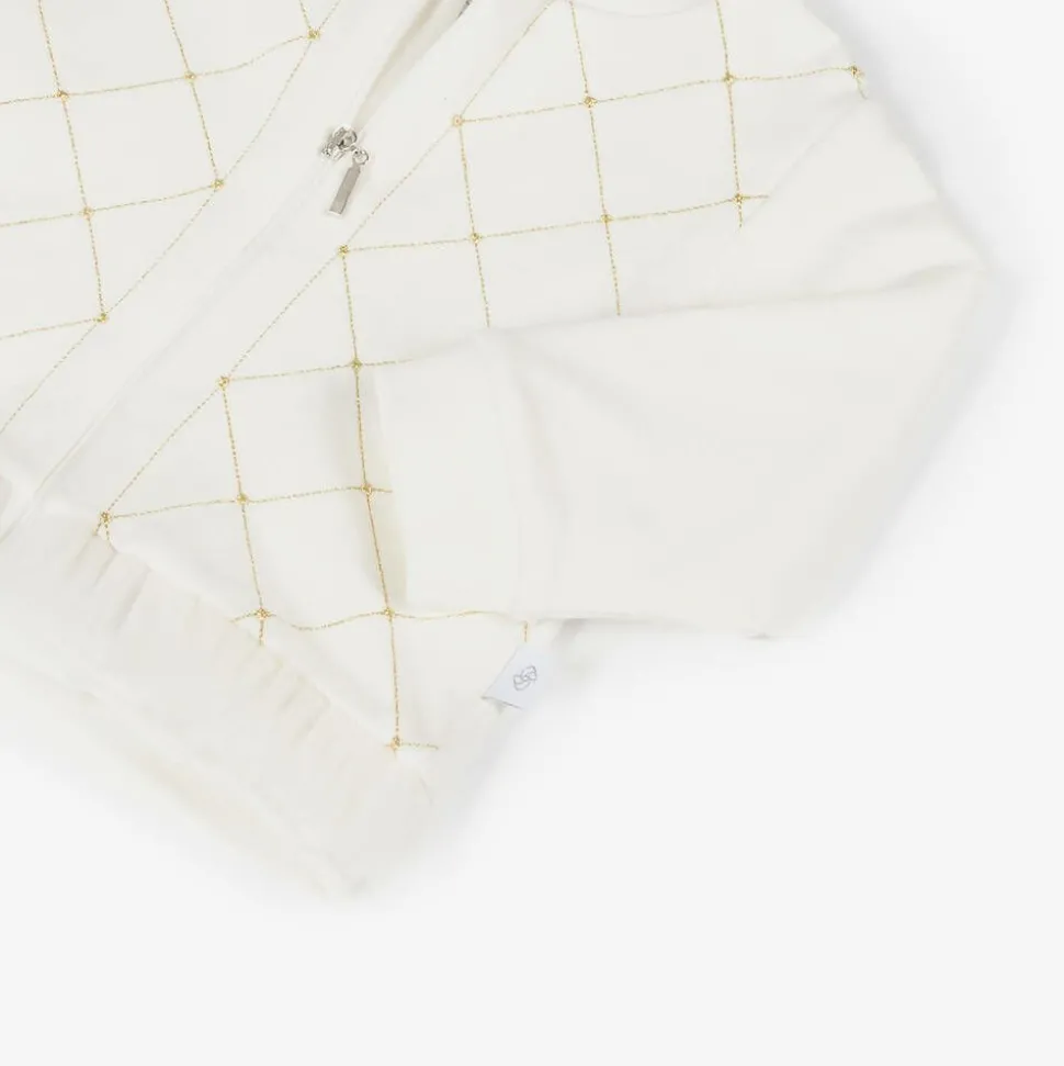 Ivory tracksuit for little girls by Sofija, made from soft cotton jersey. Trimmed with a tulle ruffle, the zip-up hoodie has a stylish check design on the front, embroidered in shimmery gold thread. The matching joggers have a gently elasticated waistband for a comfortable fit.