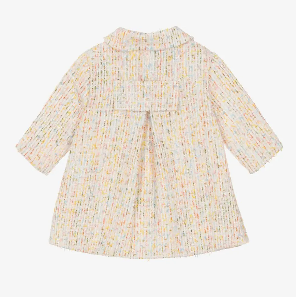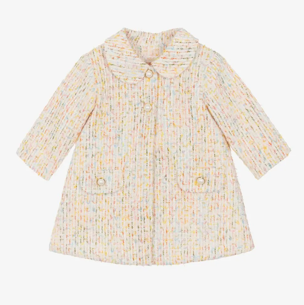 Exclusive to Childrensalon and in a traditional style, this soft cotton tweed coat for little girls is by Sofija. With colourful thread in the weave, it has gold-trimmed, pearl bead button fastenings and faux pockets on the front. There is a jersey lining for comfort.