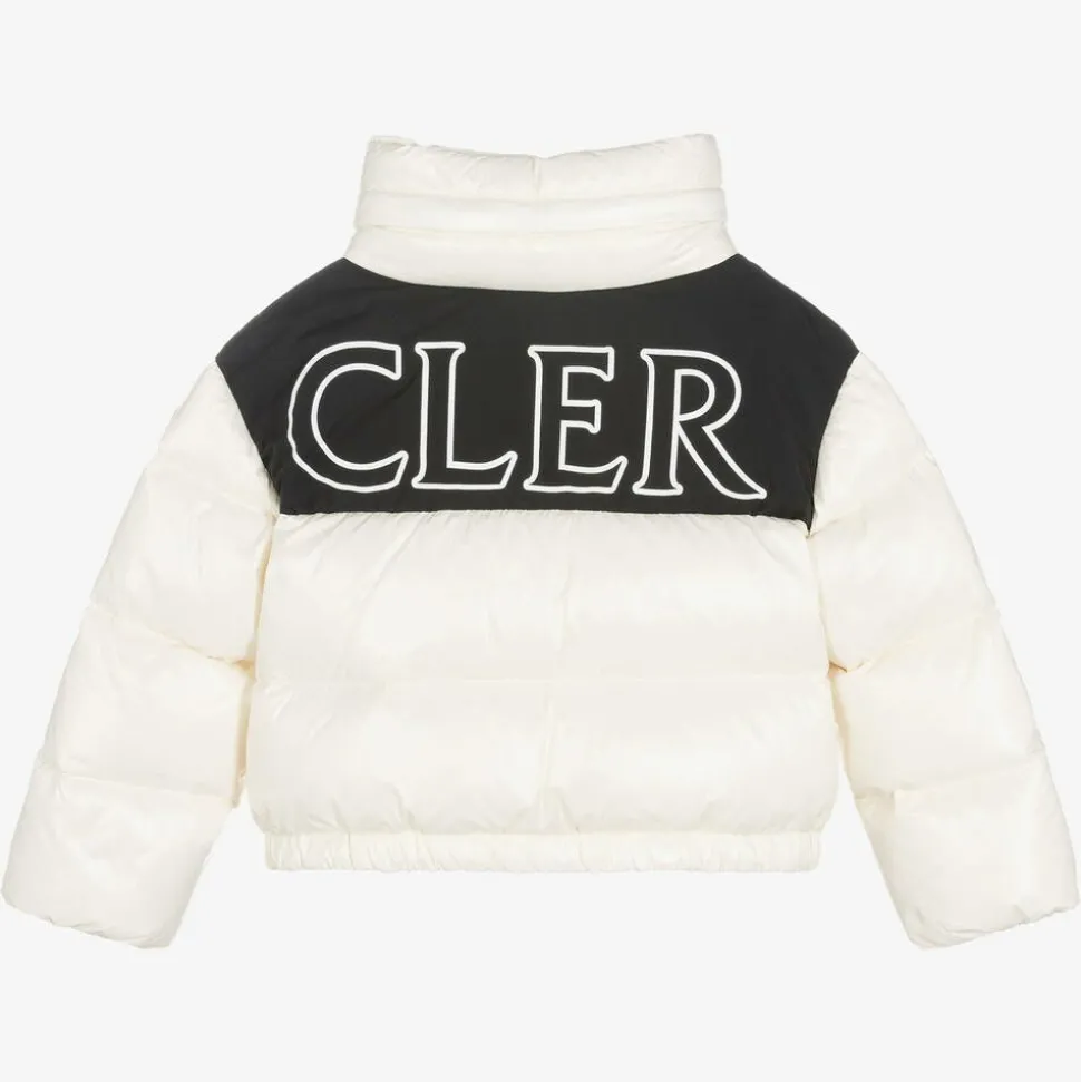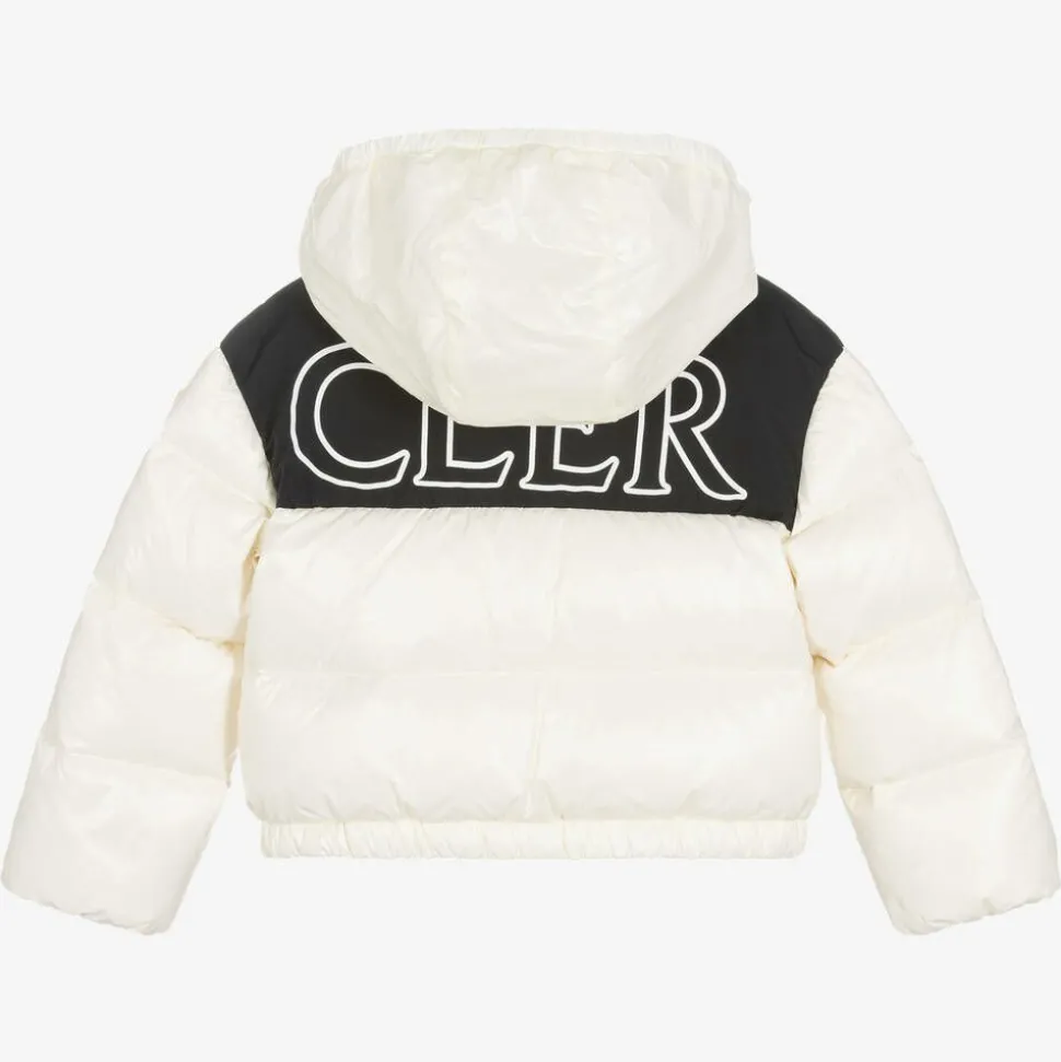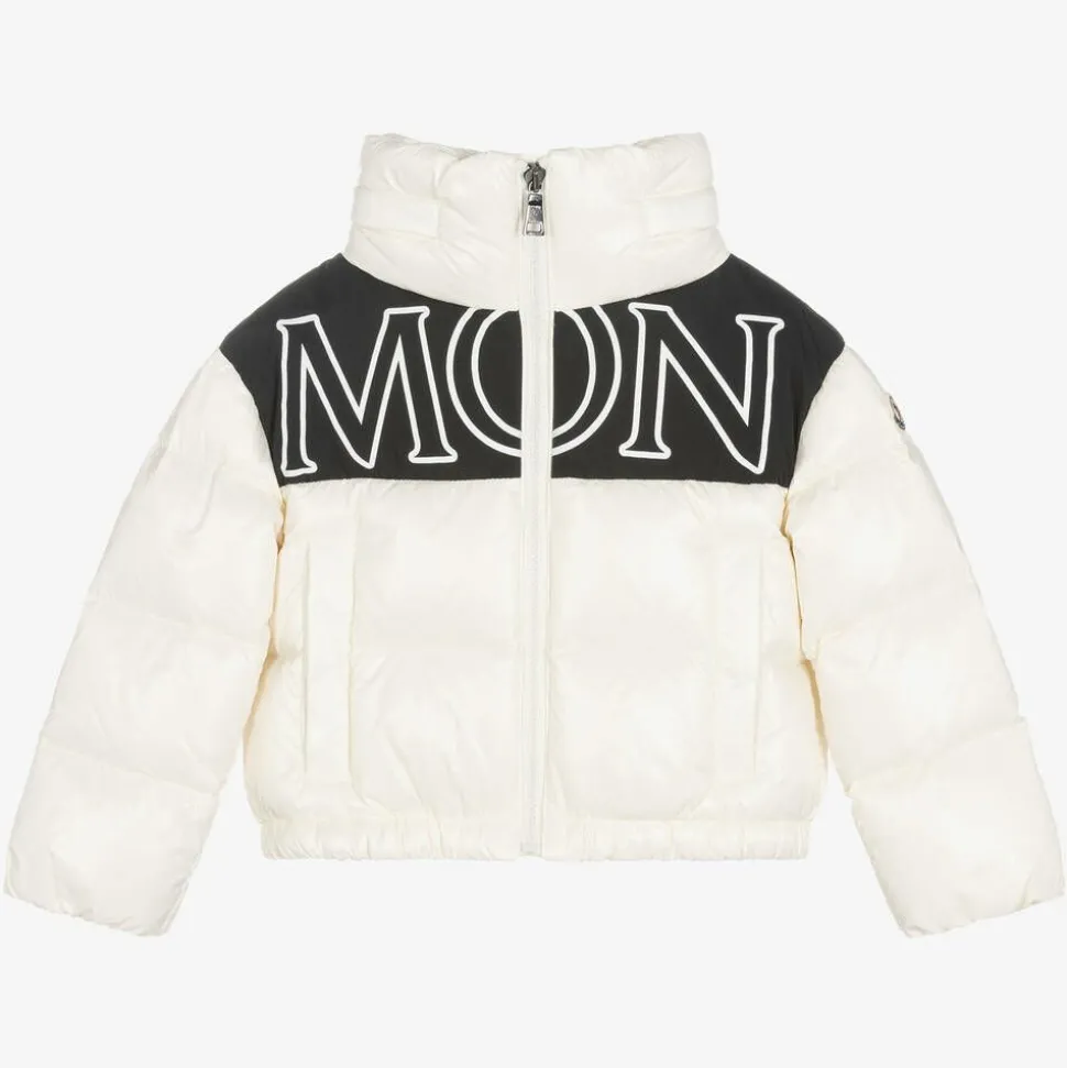 Ivory down padded jacket by Moncler Enfant. This classic Mini-me 'Gers' design has been recreated for style-conscious girls and is made from signature nylon laquƩ, filled with down and feathers for warmth. The jacket features a concealed hood in the collar and a contrast logo print in black and white. It has a front zip fastening, pockets at the side and a felted logo badge on one sleeve.