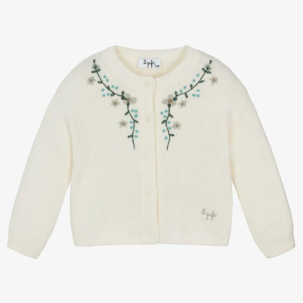 Beautifully hand-embroidered with a floral design in green, beige and blue, this ivory cardigan for little girls is from luxury Italian brand, Il Gufo. A classic crew neck design, it is softly knitted in wool for a gentle yet cosy feel against the skin. Adding a designer touch, the button fastenings are patterned with logos and there is an embroidered grey logo above the front hem.