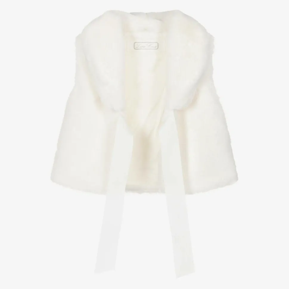 A lovely ivory gilet for girls by Lapin House, made in beautifully soft faux fur. A snug extra layer, it is lined with silky smooth fabric and styled with an oversized collar. It ties with colour-matched grosgrain ribbon, creating a lovely bow on the front.