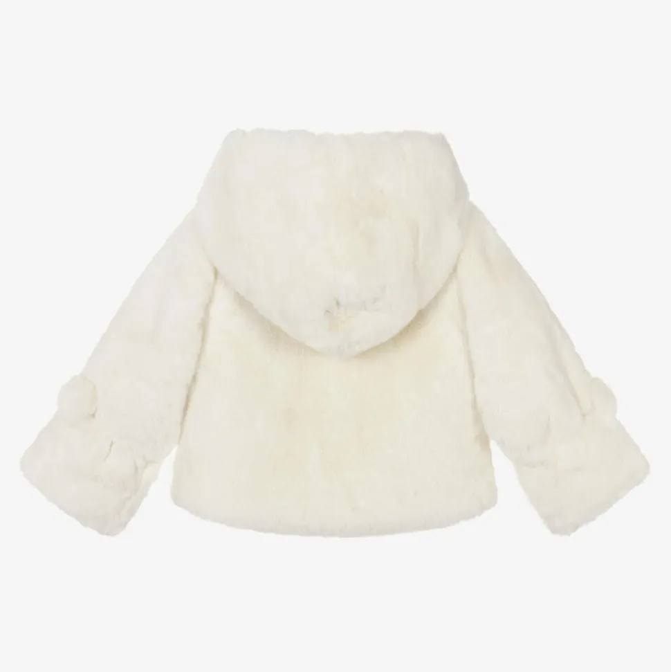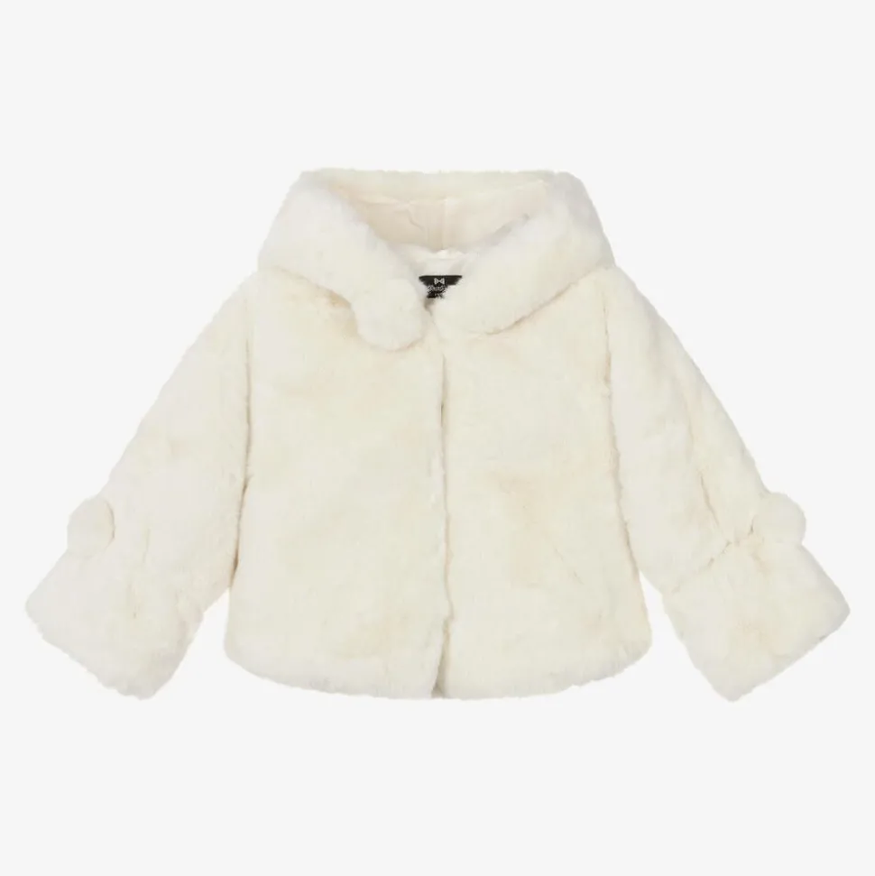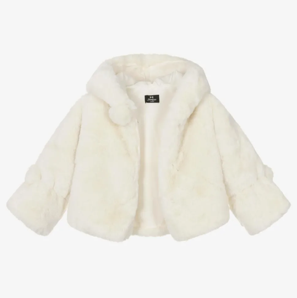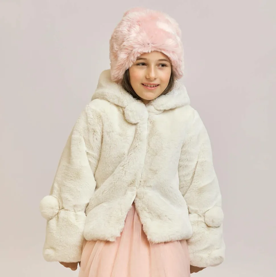 Gorgeously soft, this ivory faux fur jacket for girls is from Bowtique London. So lovely and cosy, this hooded jacket has cute pom-pom detailing on the top of the popper fastening placket and on the gently elasticated sleeve cuffs. It is fully lined for optimum comfort.