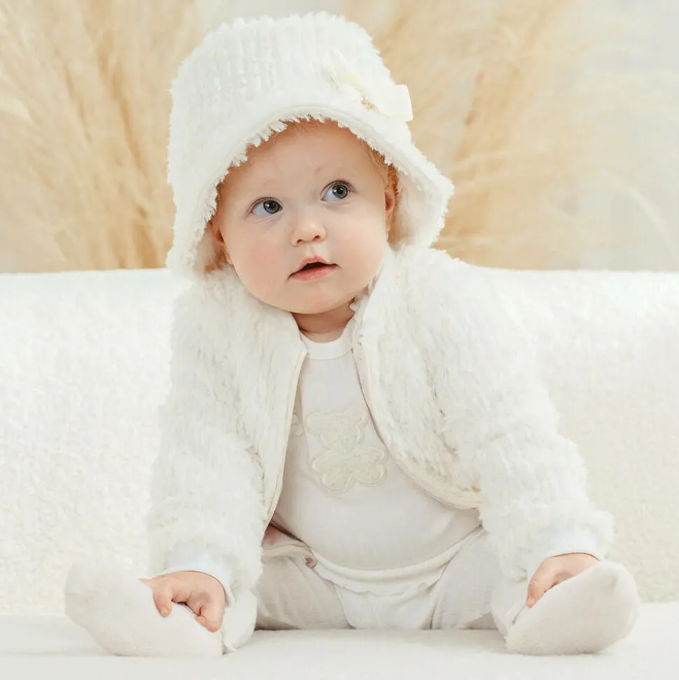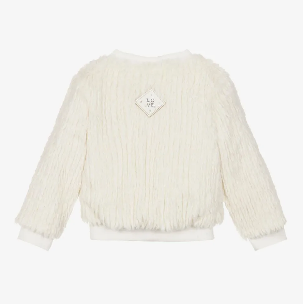 Beautifully soft ivory faux fur jacket for little girls by Jamiks, with white ribbed trims. It fastens with a zip on the front and has a pink floral lining made in viscose jersey for comfort. On the back is a white badge with 'Love' repeat-printed in shiny silver, with a logo on one side.
