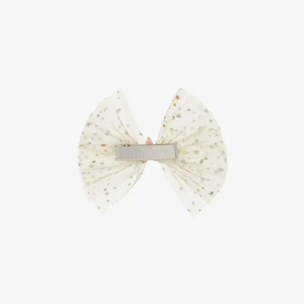 Great for parties, this ivory hair clip is from Bowtique London. The handmade tulle bow is decorated in glittery gold stars with a charm in the centre. It is set on a fabric-covered clip for comfort.