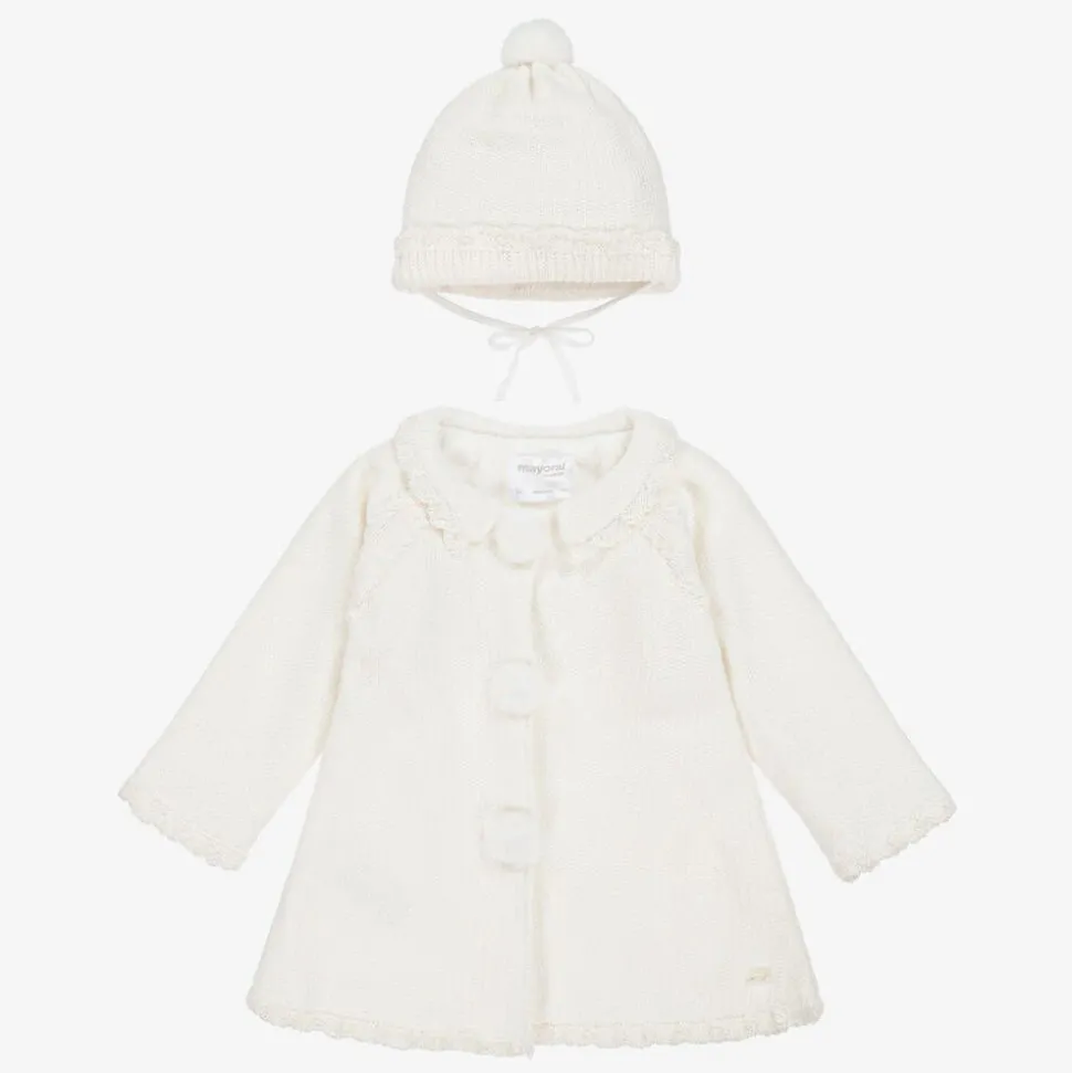 Ivory pram coat and hat set for baby girls by Mayoral, knitted in a soft cotton and viscose blend. Keeping little ones warm and snug, this adorable layer has scalloped trims and faux fur pom-poms on the front. It has a beautifully soft velour lining, a classic collar and concealed popper fastenings. The matching hat has a cute pom-pom on the top and easy tie fastenings that secure comfortably under the chin.