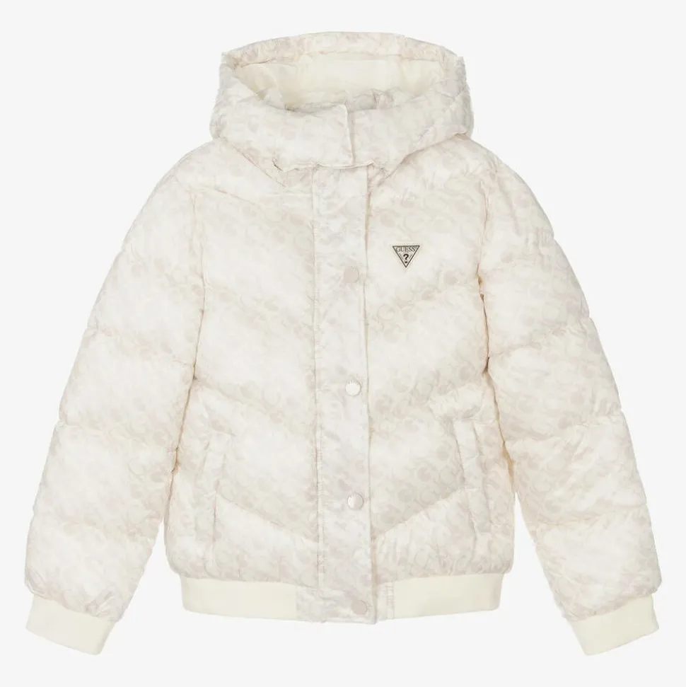 An ivory puffer jacket for girls by Guess, made and lined in silky fabric. Patterned with a tonal monogram print, this designer jacket has logo-engraved poppers and a zip to fasten on the front. It has mid-weight padding for cosiness and the iconic Triangle logo patch on the front. The velcro-closing hood is removable for alternative looks, the cuffs are ribbed for shape, and the side pockets are ideal to warm hands.
