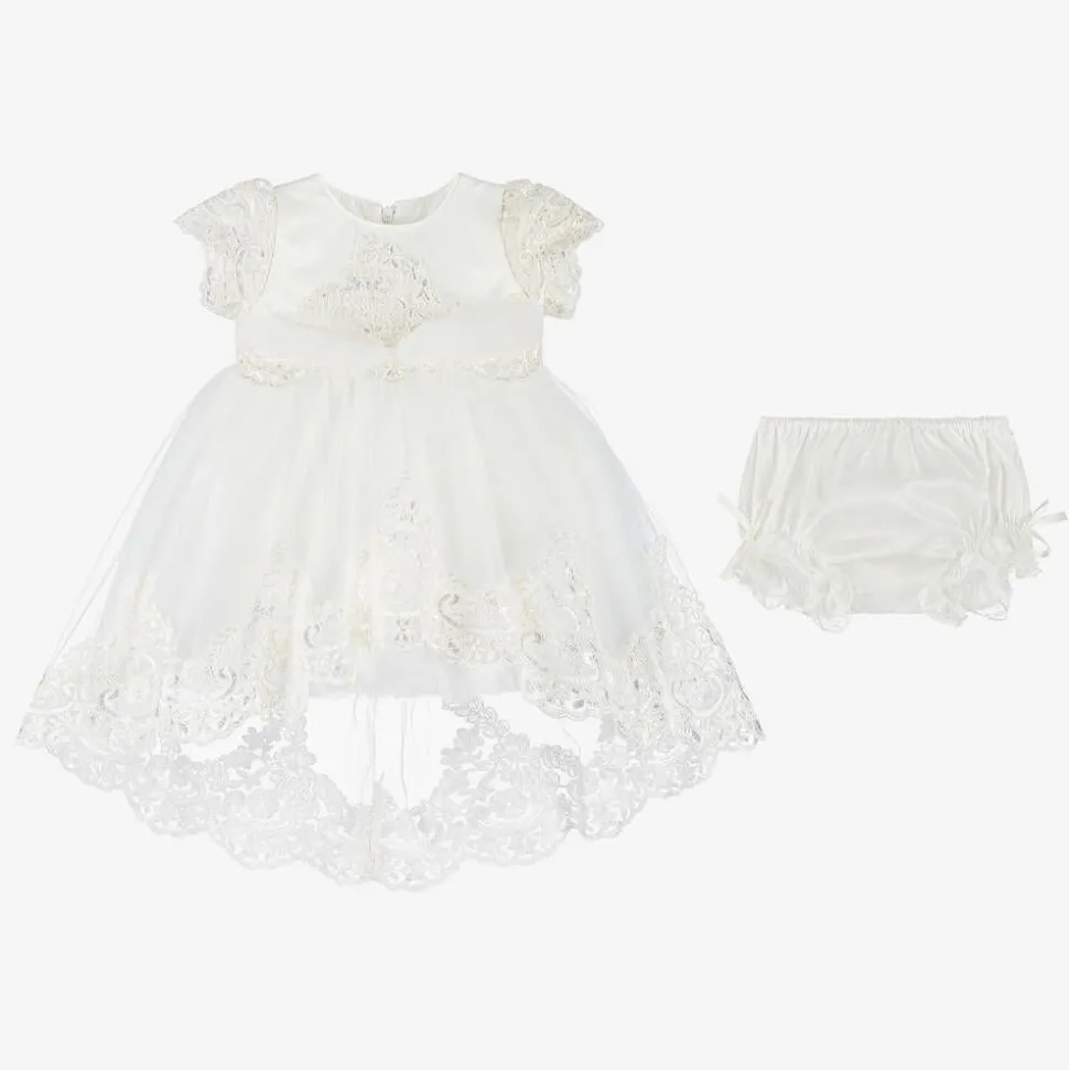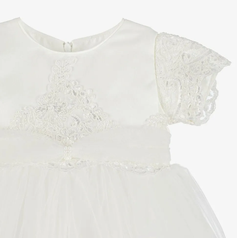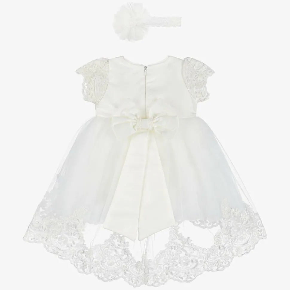 A pretty ivory dress set for little girls from Andreeatex. The satin bodice has delicate ivory lace, with a fixed tulle and pearl waistband. The skirt has layers of tulle and matching lace trim, with a detachable satin bow and a longer hem on the back. Lined in lightweight cotton for comfortable wear, the dress fastens neatly with a concealed back zip. This gorgeous set comes with a lace and tulle headband to complete the look. Smaller sizes come with knickers.