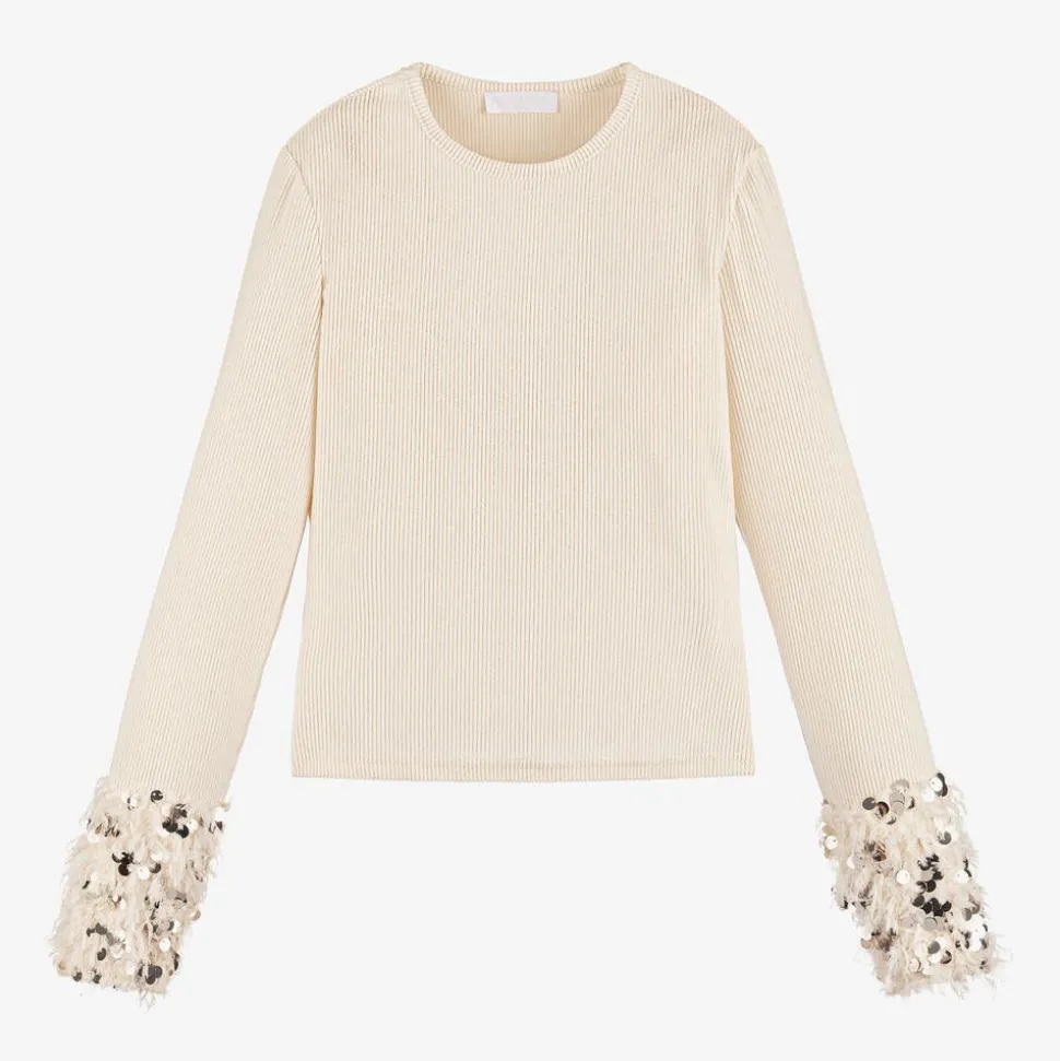 Lovely ivory top for girls by Fun & Fun, made in soft, ribbed jersey. The fabulous faux feather cuffs are embellished with shining sequins for a glamorous touch.