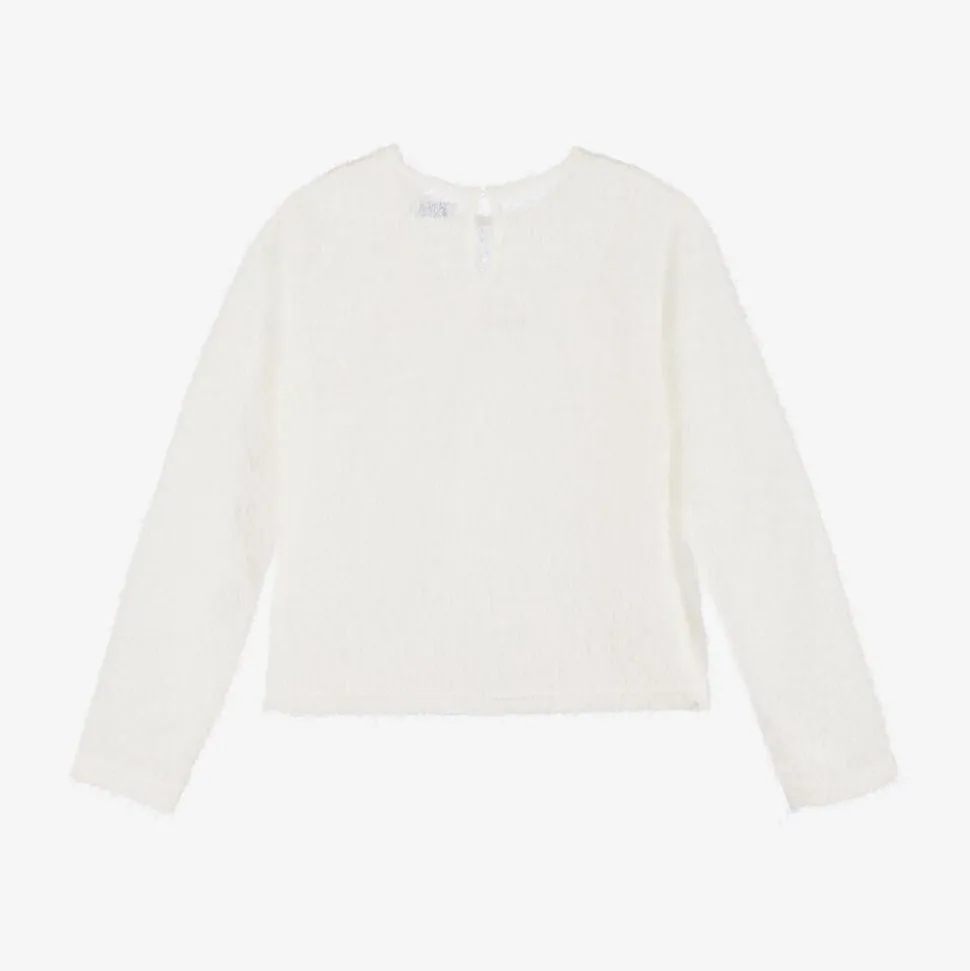Pretty ivory long-sleeved top for older girls by Mayoral. Soft and stretchy, it is made in a lightweight knit with a fluffy look and silver threads for added sparkle. It has a single button fastening on the back. This versatile top comes with a cotton jersey camisole, which can also be worn separately.