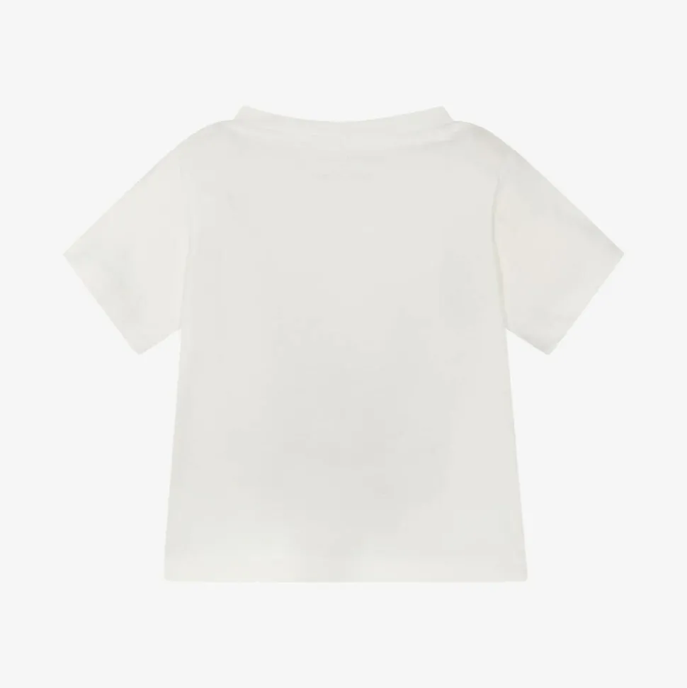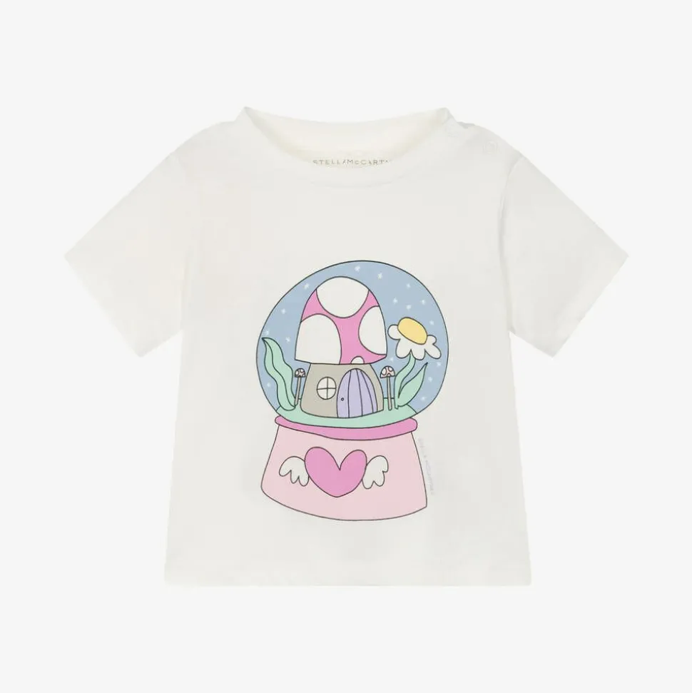 Younger girls ivory cotton T-shirt by Stella McCartney Kids with a sweet fairy snowglobe print. Lightweight for those warmer months, this casual top is made of soft organic jersey and has useful popper fastenings on one shoulder.