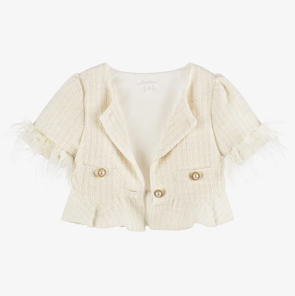 Exclusive to Childrensalon, a chic, ivory tweed trouser set for girls by Patachou, woven with a subtle, sparkly thread. Ideal for a special occasion, both pieces have eye-catching feather trims and are fully lined with cotton for comfort. The short-sleeved jacket has patch pockets, a peplum hem and beautiful pearl and diamanté buttons for a glamorous touch. The stylish trousers have an adjustable waistband and side zip fastening with a matching, statement button.