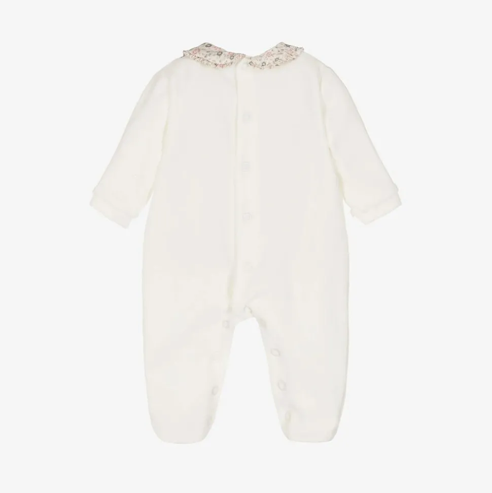 A delightful ivory babygrow for girls by Pureté Du… Bébé, made in soft and comfortable cotton velour. A beautiful pink and beige floral design can be seen on the collar, the enclosed feet and the panel on the front. For quick and easy dressing there are poppers on the back and between the legs and for a pretty finish a decorative bow and mother-of-peal logo charm trims the front.