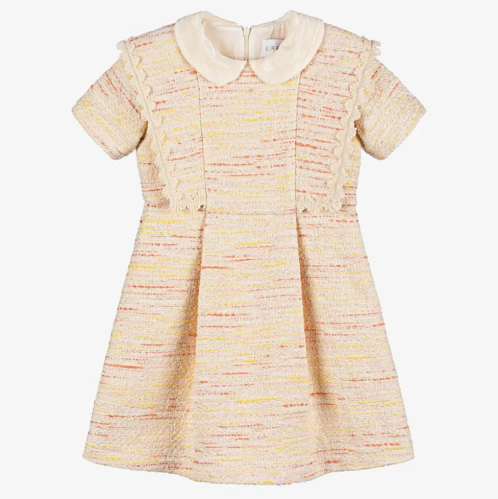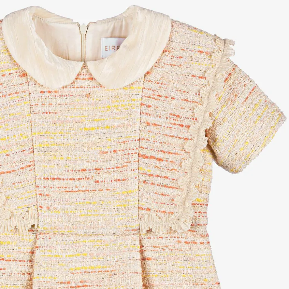 A gorgeous tweed dress for girls by EIRENE, woven with yellow and coral pink yarn to create that distinctive, textured look. This short-sleeved dress has a gently ridged velvet collar and flecks of metallic gold shimmer throughout the ivory fabric. A ruffled trim surrounds the layered bodice and a single box pleat on the skirt adds fullness from the waist. The bodice is lined with soft cotton voile and on the back, is a neatly hidden zip.
