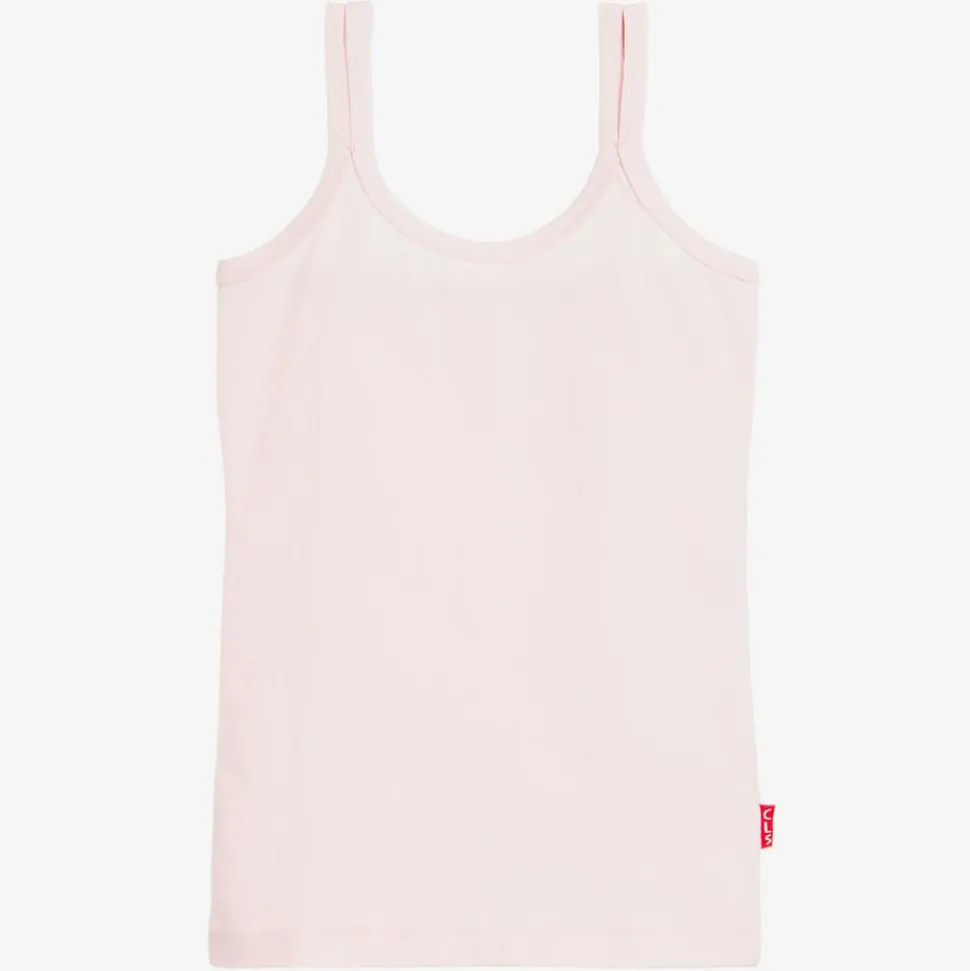 Girls light pink vest by Claesen's, made in soft and stretchy cotton jersey. A simple design, this comfortable top has thin shoulder straps which can be adjusted on the back for a secure fit.
