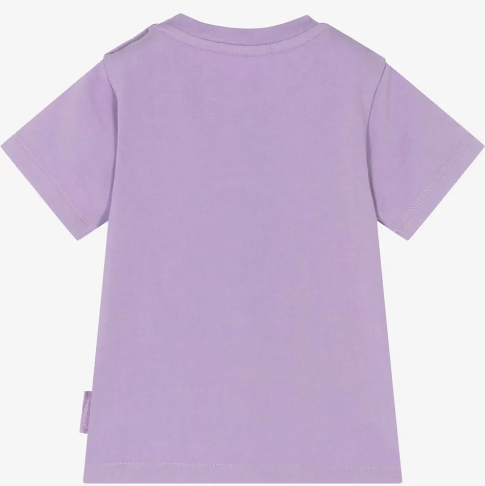 Super cute lilac purple T-shirt for little girls by French luxury brand Moncler Enfant, made in comfortable cotton jersey. Fastening with shoulder poppers, it has the brand's unmistakable logo on the front with a blue embroidered outline and colourful lettering within.