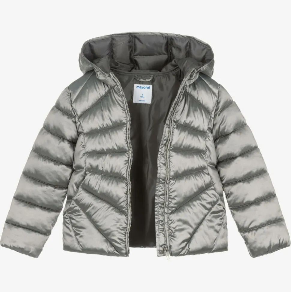 A metallic silver puffer jacket for girls by Mayoral, made in silky smooth fabric from recycled fibres. Padded for warmth, this lightweight hooded jacket has a zip fastening and concealed front pockets.