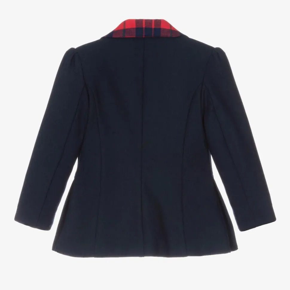 Smart navy blue blazer with red tartan trim for girls by Patachou, exclusive to Childrensalon. Made from a soft viscose blend, this satin-lined jacket has a revere collar, faux pocket detail, and gold crest button fastenings. An embroidered logo on the chest adds a classic touch and there are pleats on the front hem for a stylish finish.