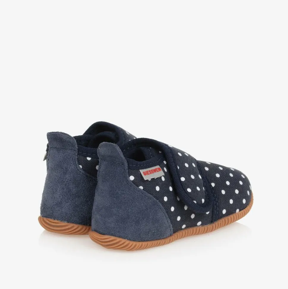 Navy blue slippers for young girls by Giesswein. Patterned with a sweet white dotted print, they have smooth woven cotton uppers, a soft jersey knit lining, and a lightly padded leather insole. Fastening with a velcro strap on the front, they have suede leather trims on the heels, a logo tab on the side, and non-slip rubber outsoles for better grip.