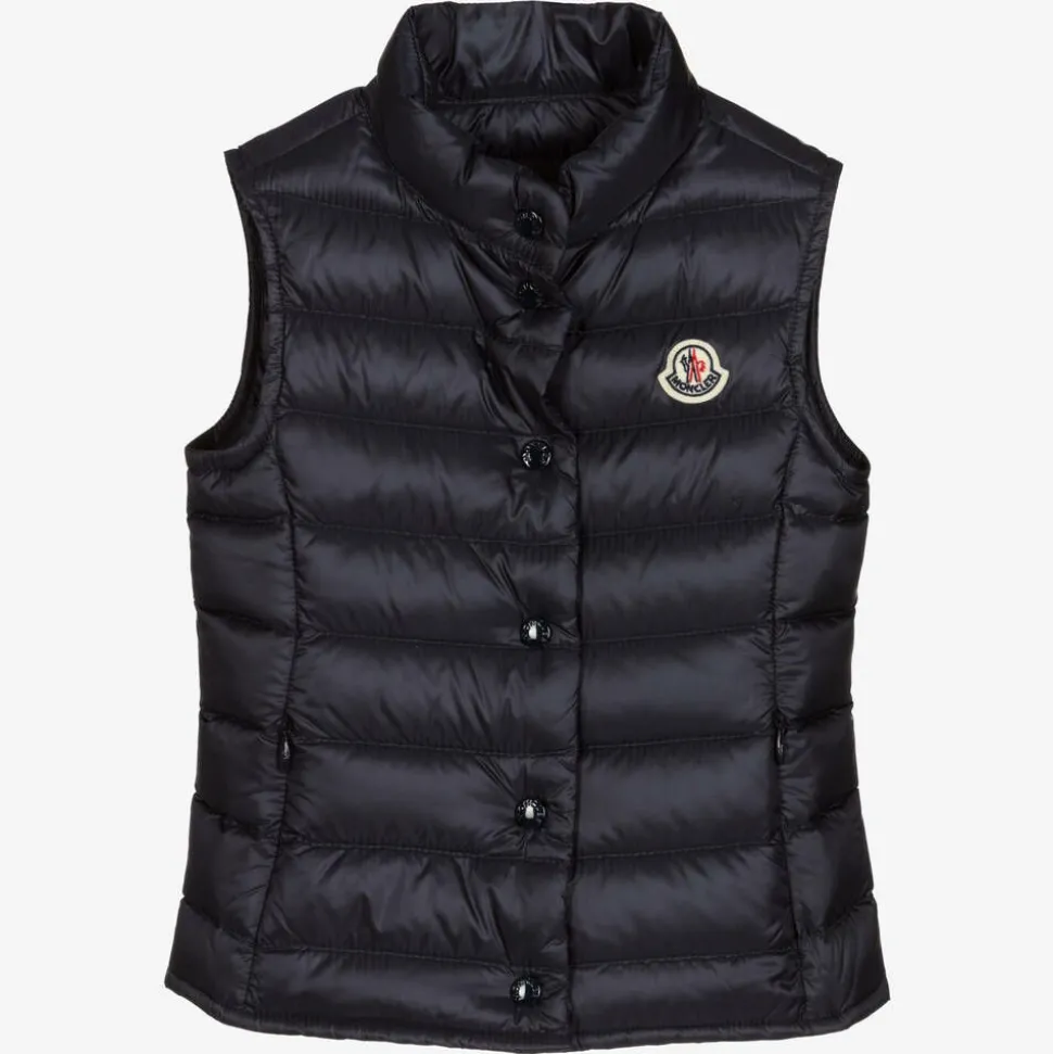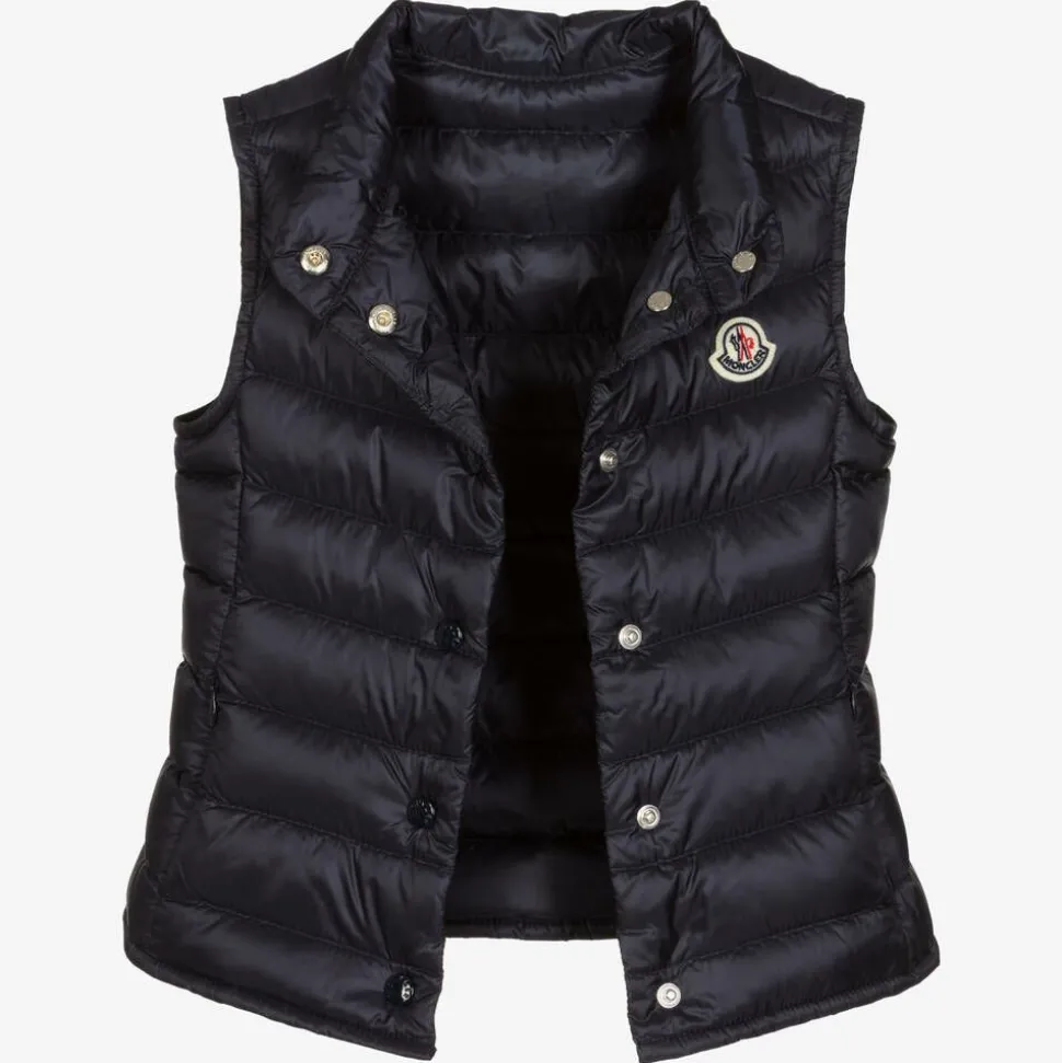 Navy blue puffer gilet for girls by Moncler Enfant, made in the luxury brand's signature longue saison fabric. Silky smooth and lightweight, this water-repellent jacket is padded in soft down for warmth without the weight. It fastens with branded poppers on the front and has concealed zipped front pockets. It has a gently fitted hemline for a feminine silhouette, with the designer's felt logo patch on the chest adding a signature finish. Practical and packable, it comes with a matching storage bag.