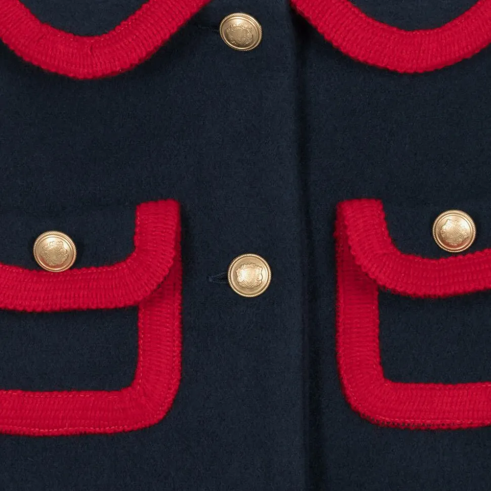 Smart navy blue coat for girls by Portuguese brand Patachou, with red trim for an eye-catching touch. Styled with a martingale belt on the back, this traditional design is made in soft felted fabric for a cosy feel, with a satin lining for comfort. It fastens with gold-tone crest buttons, matching the decorative buttons on the front pockets.