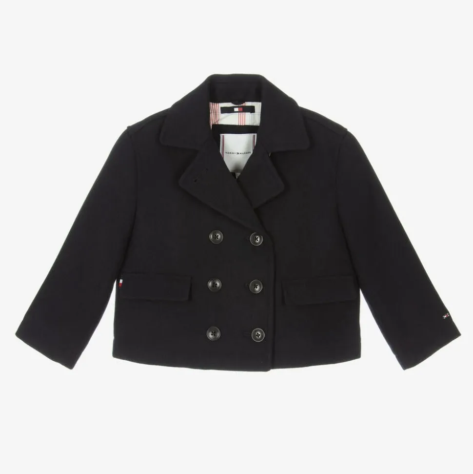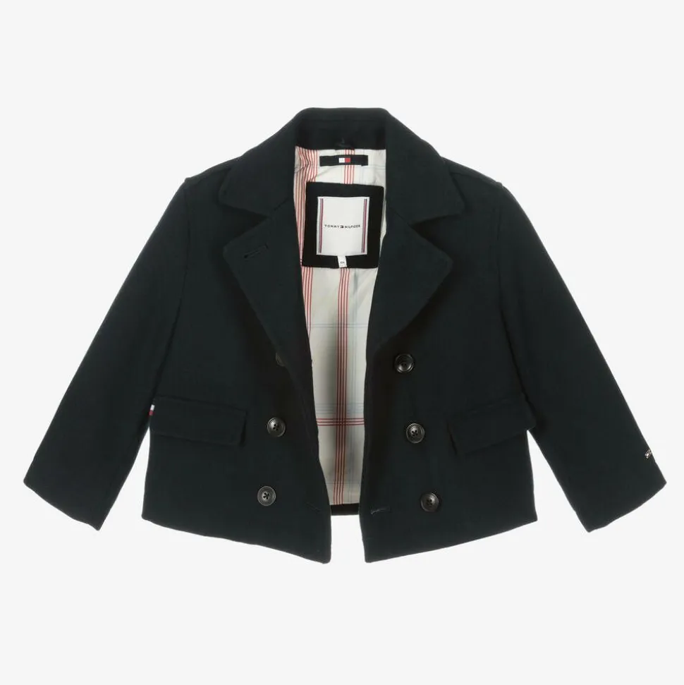 A classic and stylish look for girls, this navy blue peacoat is from American brand Tommy Hilfiger. It is made from a felted wool blend and features a double-breasted design with notched lapels, front pockets, and branded button fastenings. The jacket is lightly padded for warmth and has a lovely contrast check silky lining. Tricolour tabs on the front and back, along with a flag logo plate on one sleeve, add a discreet designer touch.