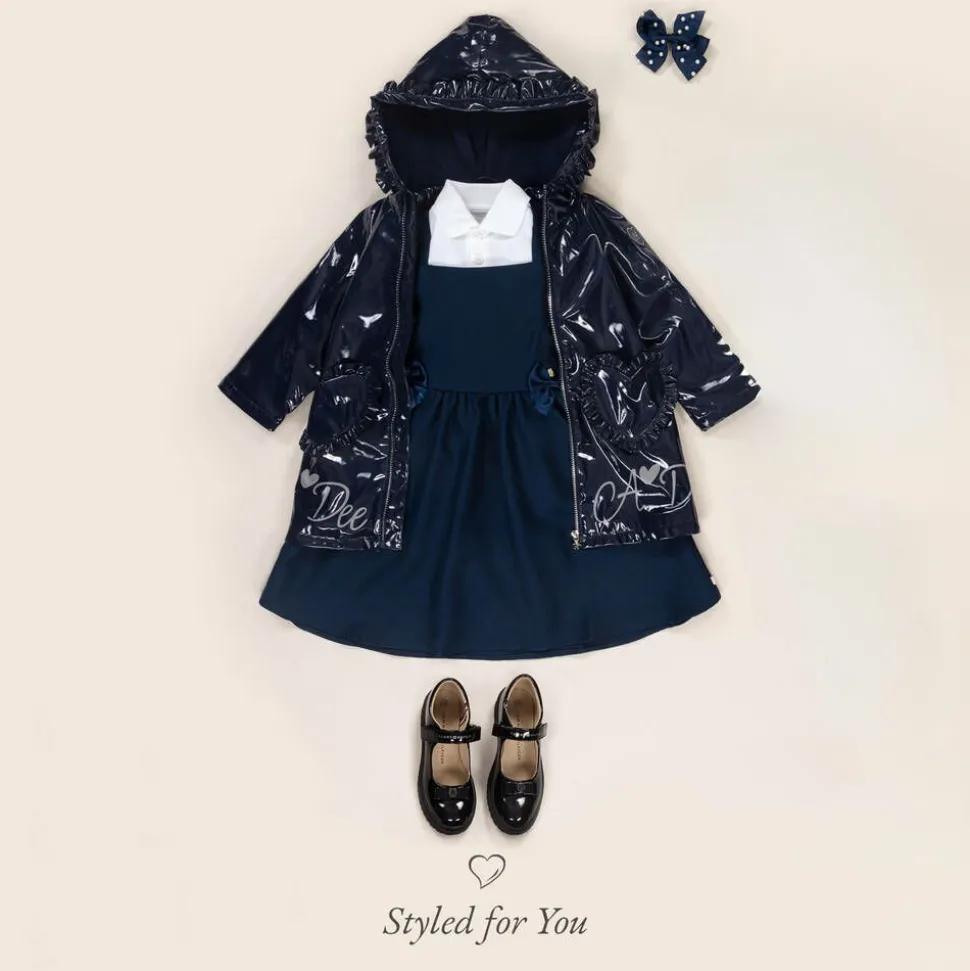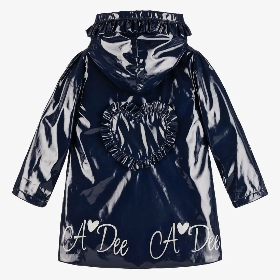 A glossy navy blue hooded raincoat for girls by A Dee, with pretty ruffle trims. Water-resistant and cosy, it has a soft fleece lining and fleece-lined, heart-shaped pockets on the front. Reflective logo prints on the front and back, and a logo patch on one sleeve, add a stylish yet functional designer touch. The diamanté-trimmed zip has a silver-tone branded pull and a large ruffle-trimmed heart on the back completes the look.