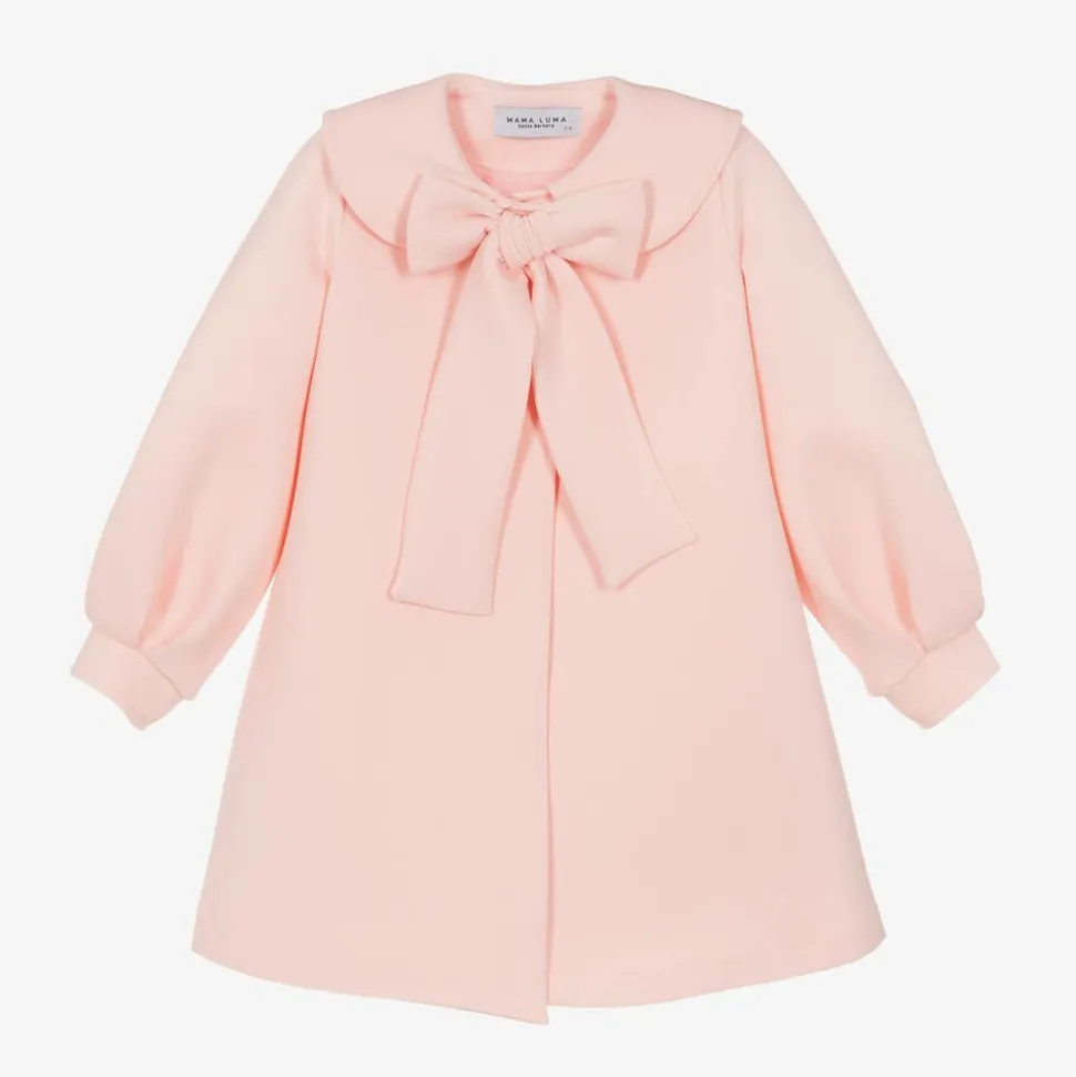 Sweet and pretty, this pink coat for girls is by Mama Luma. Made from soft neoprene jersey with a lightweight woven lining, it has a statement rounded collar and box-pleated detailing on the long sleeves. It fastens with a single popper on the neckline, concealed by an appliqué bow for a delightful finish.