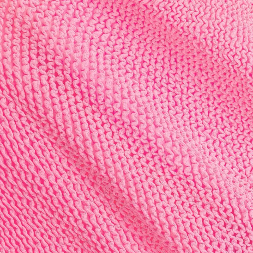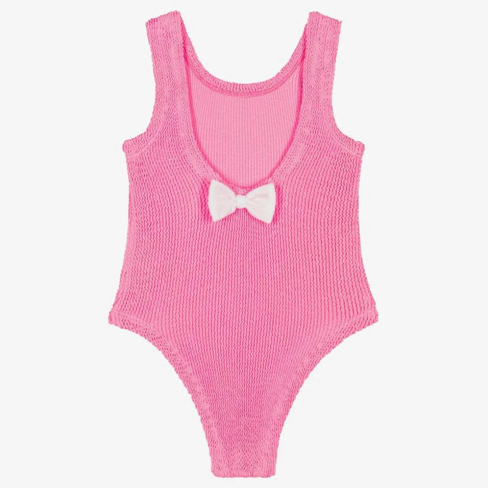 Adorable bright pink swimsuit for girls by British brand Hunza G, in the iconic Original Crinkle fabric inspired by the adult collection. For timeless beachwear styling, this one-piece has a square neckline and a scooped back decorated with a white bow. The material offers effortless stretch so that the swimsuit fits your child as they get older.