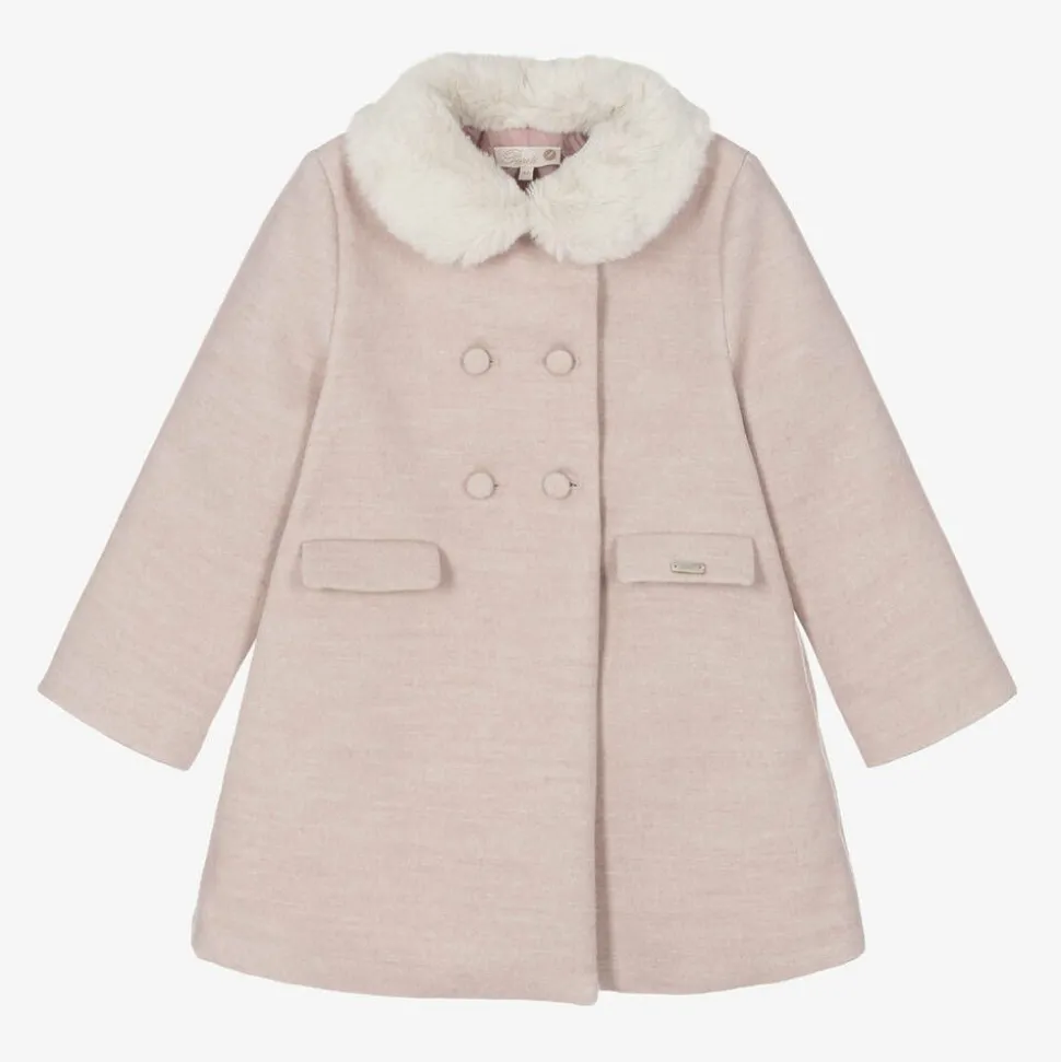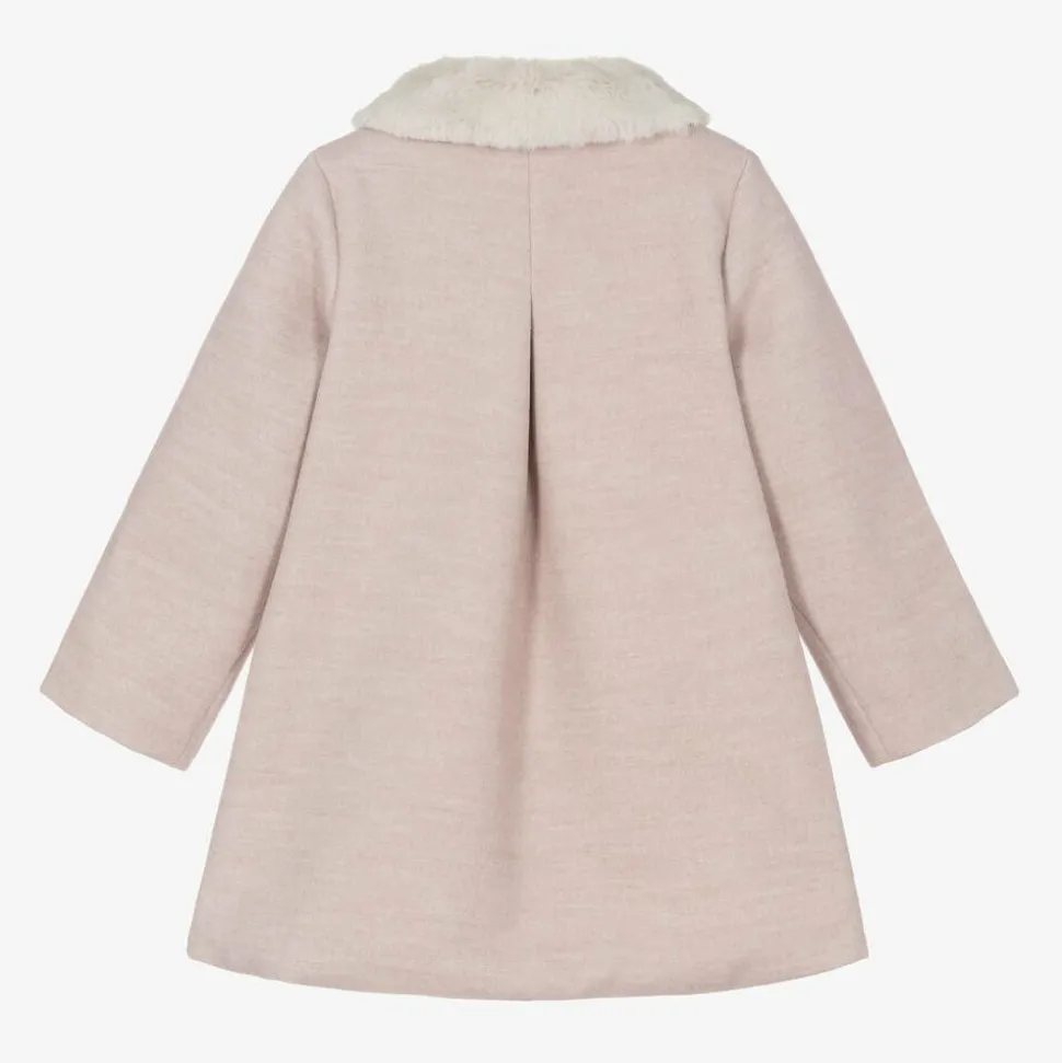 A lovely pale pink coat for younger girls by Pureté Du… Bébé, made in beautifully soft fabric with a felted feel. Lined in silky satin, this traditionally-styled coat has double-breasted button fastenings and a collared neckline. There are two decorative pockets on the front, one of which is branded with a pearlescent logo charm. For a different look, the coat comes with a detachable faux fur collar which attaches to the neckline with elasticated loops and hidden buttons.