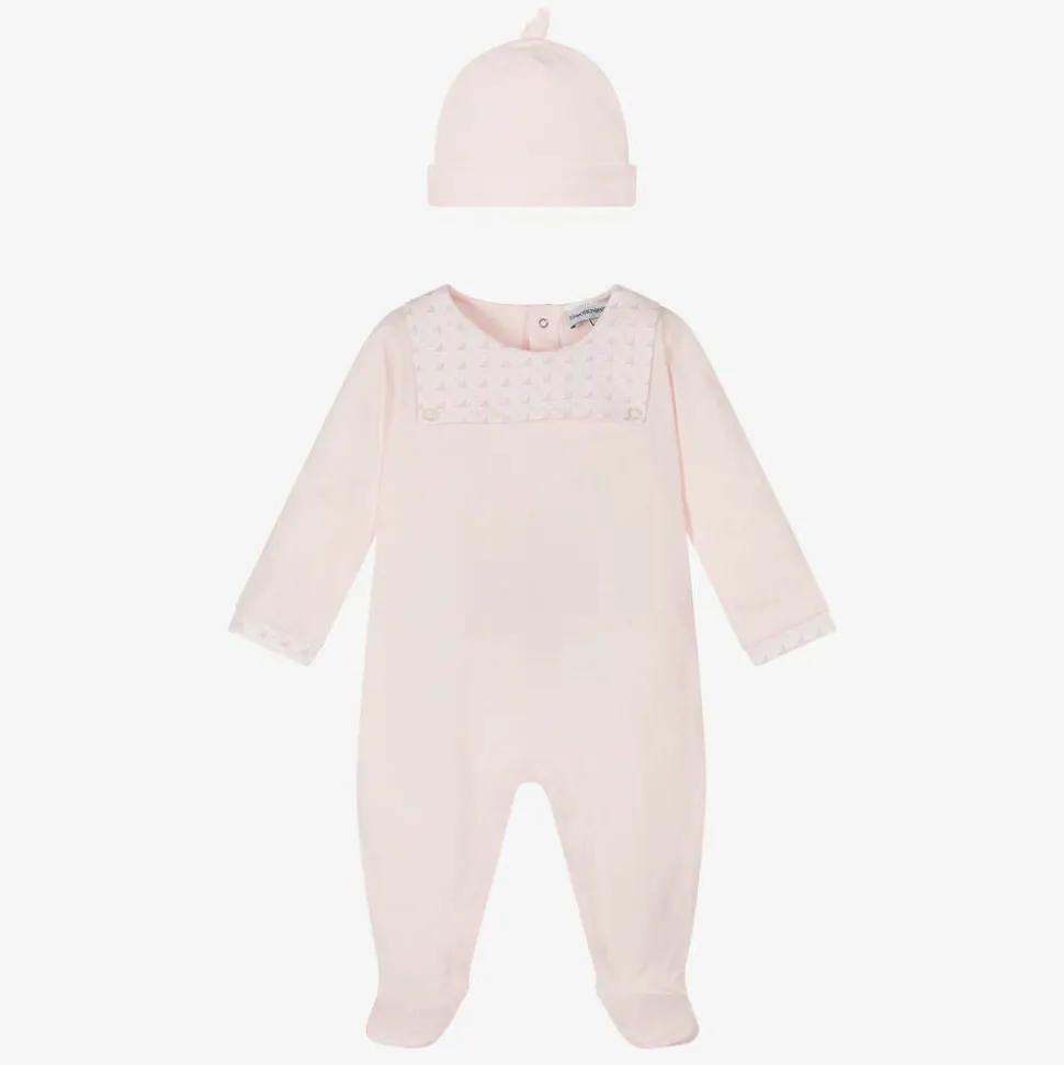 Adorable pink babygrow and hat set for girls by Emporio Armani, made in soft cotton jersey for gentle-on-the-skin comfort. Adding a discreet designer touch, the bib-style collar has a pink Eagle logo pattern, with decorative, branded buttons in each corner and matching trim on the cuffs. It fastens with poppers on the back and between the legs and the matching layette hat is made in a cosy double layer with a sweet turned up brim and knot detail.